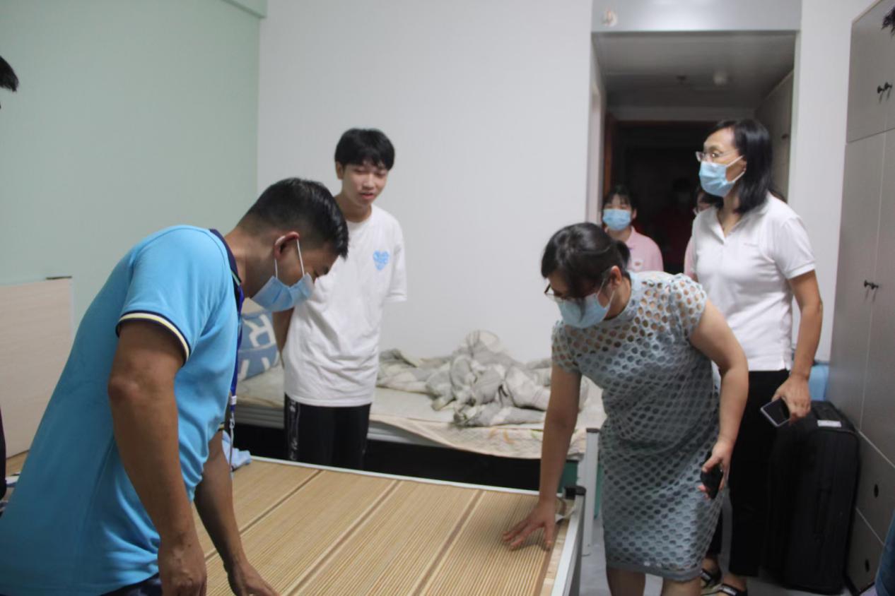 “家是哪里的?”“到學(xué)校還適應(yīng)嗎?”“住的習(xí)慣嗎?”每到一處,領(lǐng)導(dǎo)會親切地詢問同學(xué)們生活是否適應(yīng)、入學(xué)感受如何,輕松的對話迅速拉近了彼此的距離。同時希望同學(xué)之間在生活中要相互照顧,學(xué)習(xí)中要互相幫助,共同進步,“挺適應(yīng)的,”“謝謝老師” 新生們狀態(tài)精神飽滿,都很適應(yīng)宿舍的生活,對領(lǐng)導(dǎo)和老師們的到來十分感動,紛紛禮貌道謝?!坝惺裁磫栴}和需求,及時向宿管阿姨和輔導(dǎo)員老師反饋”,領(lǐng)導(dǎo)告訴同學(xué)們,學(xué)校所有老師都會第一時間幫助解決。