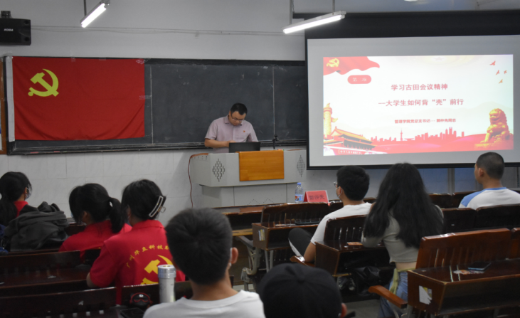 2022年3月17日下午4點,管理學(xué)院黨總支書記郭仲先同志給團學(xué)、黨建干部上了一堂題為“學(xué)習(xí)古田會議-大學(xué)生如何背‘殼’前行”的思政課。本次會議由陳宣廷同學(xué)主持。