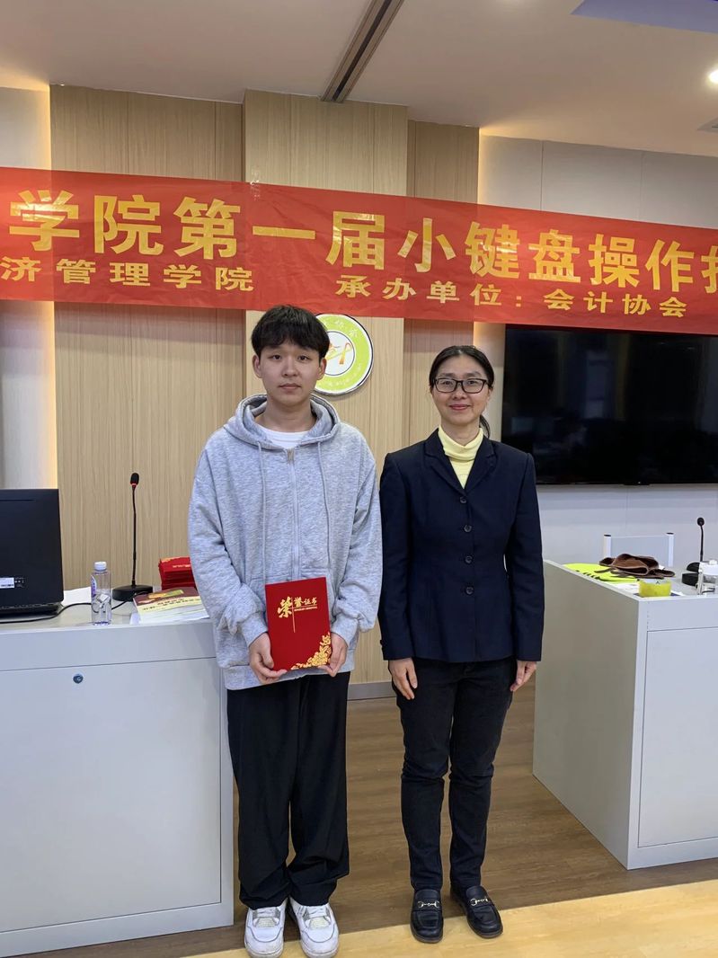 圖為 會(huì)計(jì)協(xié)會(huì)指導(dǎo)老師楊老師為獲得三等獎(jiǎng)的選手頒獎(jiǎng)