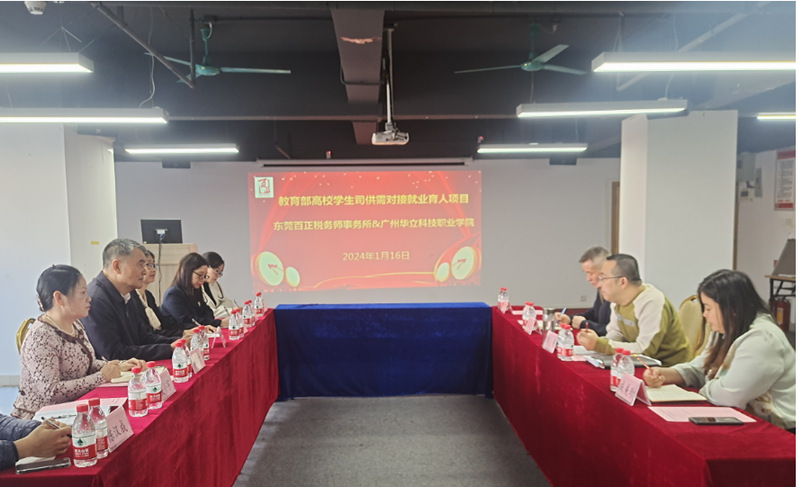 在校企供需對接中為進一步深化校企合作、產(chǎn)教融合工作,了解行業(yè)發(fā)展新趨勢,為我校財經(jīng)類學(xué)生提供更多、更好的實習(xí)實踐機會。1月16日上午,廣州華立科技職業(yè)學(xué)院陳德清校長率經(jīng)管學(xué)院院長梁慧貞、副院長朱向平及教師代表一同前往東莞百正稅務(wù)師事務(wù)所開展訪企拓崗促就業(yè)活動。東莞百正稅務(wù)師事務(wù)所熱情接待我校到訪一行。雙方針對人才培養(yǎng)、師資團隊創(chuàng)新、實踐教學(xué)創(chuàng)新、教材創(chuàng)新、社會服務(wù)等展開了交流與探討。