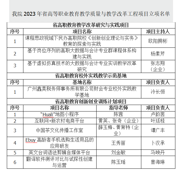 近日,廣東省教育廳公布了2023年省高等職業(yè)教育教學(xué)質(zhì)量與教學(xué)改革工程(以下簡(jiǎn)稱“省質(zhì)量工程”)項(xiàng)目立項(xiàng)名單,我院共計(jì)10項(xiàng)質(zhì)量工程項(xiàng)目成功上榜。