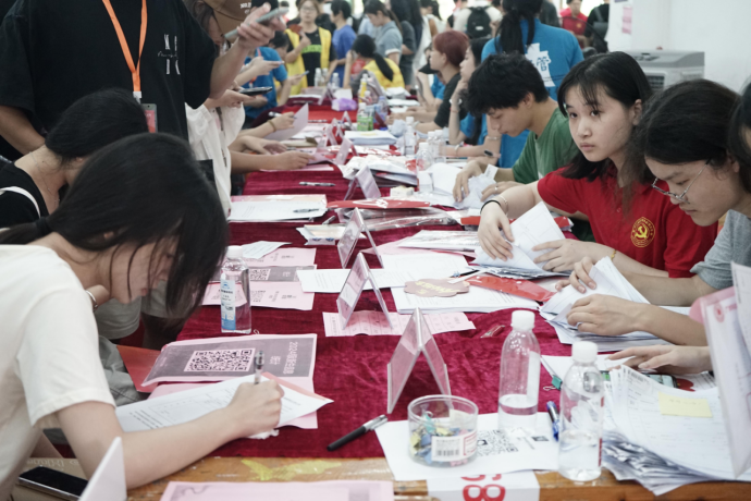 在迎新工作中,志愿者們以積極的態(tài)度去迎接新生,耐心地與家長溝通,及時為家長安排休息位置,引領(lǐng)著新生穿梭于交款繳費、報名登記、領(lǐng)取一卡通等新生辦理入學手續(xù)的必經(jīng)地點。