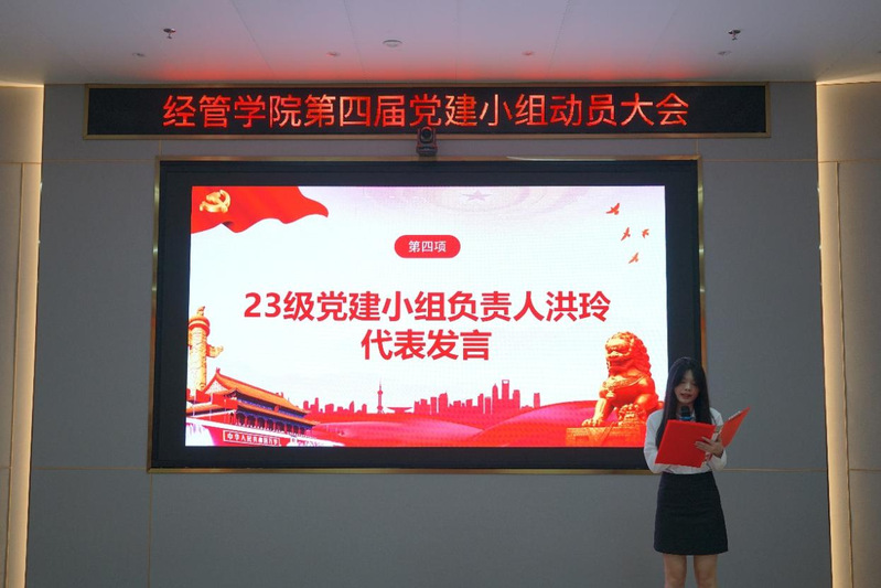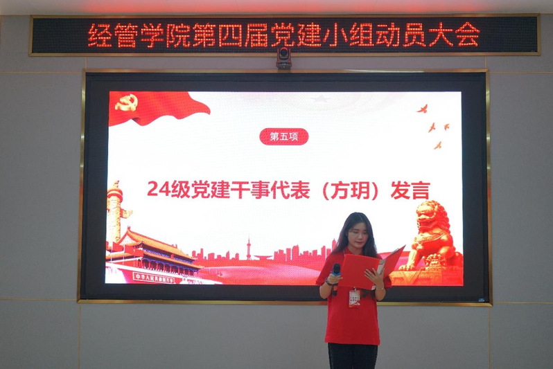 24級黨建干事代表方玥同學(xué)發(fā)言。她表示,新一屆黨建小組將始終把政治理論和業(yè)務(wù)知識學(xué)習(xí)作為必修課,創(chuàng)新學(xué)習(xí)方式,提高學(xué)習(xí)效果,以飽滿的熱情投入到工作中去,為學(xué)院黨建工作助力,積極參加各種活動,大家互幫互助,共同進(jìn)步,提升服務(wù)師生的能力。