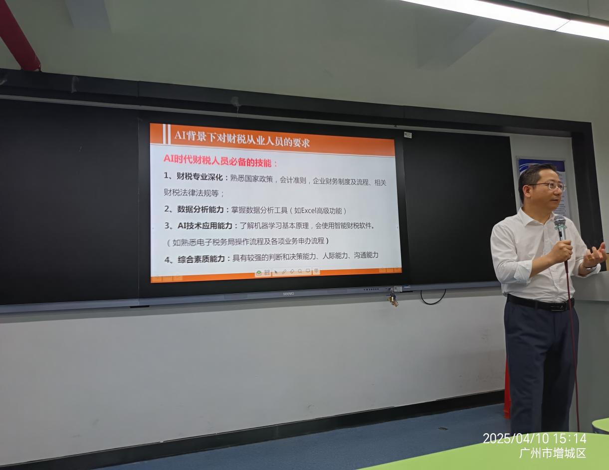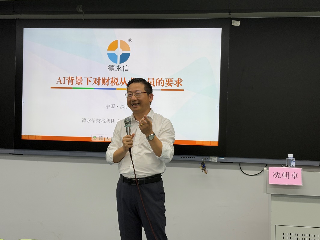 AI時代背景下,為了讓同學們破除認知壁壘、避免職業(yè)危機,引導他們精準學習,提升就業(yè)競爭力同時激發(fā)他們的職業(yè)認同感與轉型信心。2025年4月10日下午,經(jīng)濟管理學院特邀深圳市德永信稅務師事務所總經(jīng)理兼黨支部書記冼朝卓同志,在西三211教室成功舉辦了主題為“AI背景下對財稅從業(yè)人員的要求”的專題講座,此次講座吸引了眾多師生積極參與。