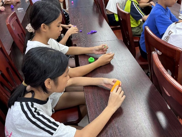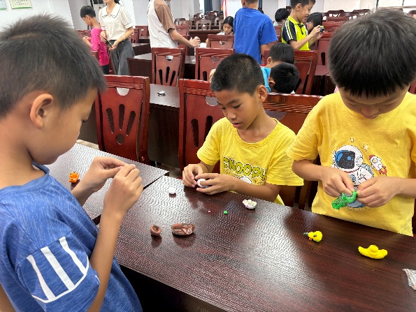 粘土元寶制作環(huán)節(jié)則充滿了歡聲笑語(yǔ)。隊(duì)員們帶來(lái)了五顏六色的粘土,手把手地教小朋友們制作粘土元寶。大家圍坐在一起,跟著大學(xué)生們的步驟,揉、捏、搓,不一會(huì)兒,一個(gè)個(gè)形態(tài)各異的粘土元寶就制作完成了。有的小朋友還發(fā)揮自己的想象,在元寶上加上了一些具有鄉(xiāng)村特色的裝飾。