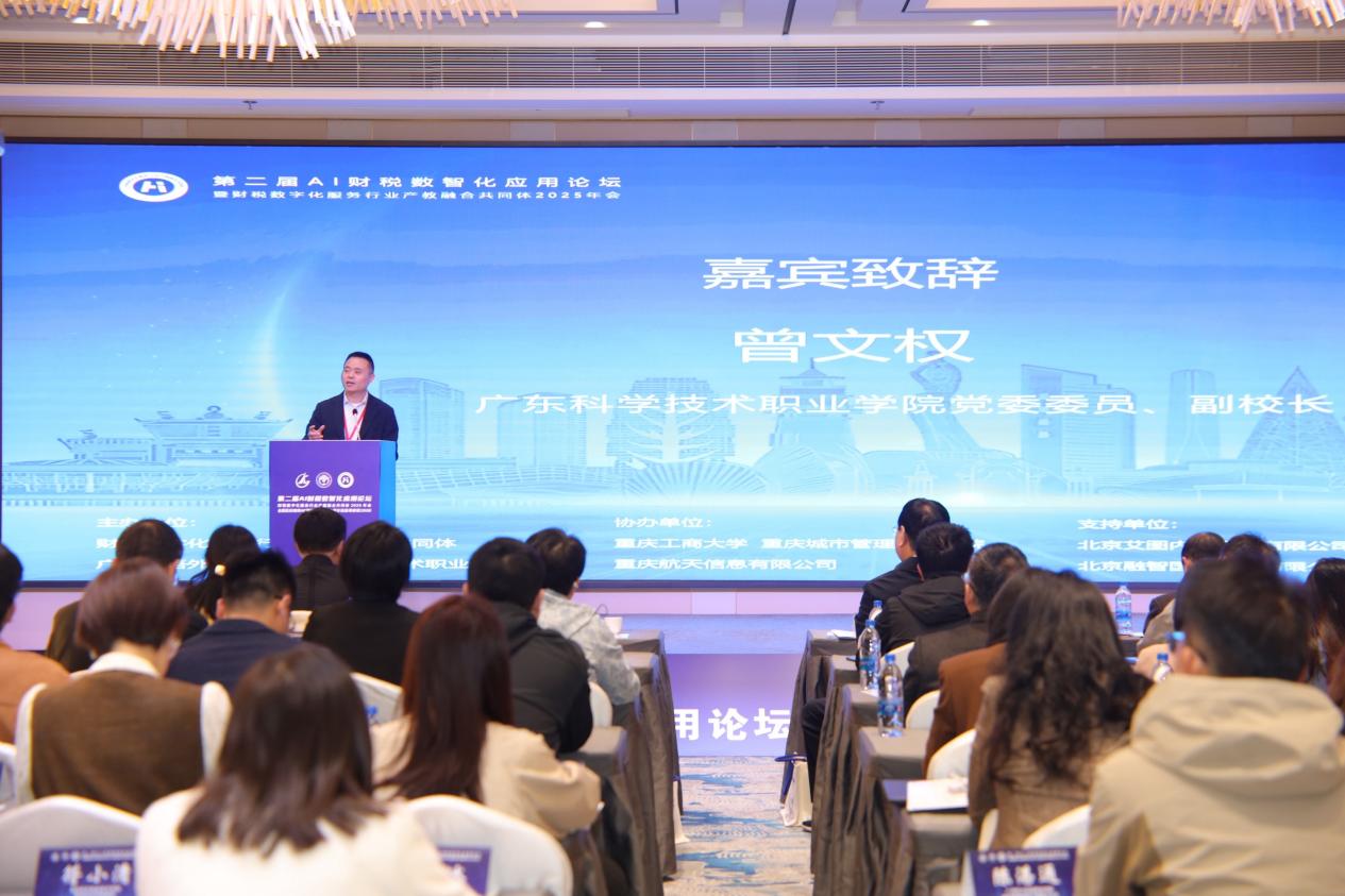 開(kāi)幕式上,財(cái)稅數(shù)字化服務(wù)行業(yè)產(chǎn)教融合共同體理事長(zhǎng)、重慶工商大學(xué)黨委常委、副校長(zhǎng)張波和廣東科學(xué)技術(shù)職業(yè)學(xué)院黨委委員、副校長(zhǎng)曾文權(quán)分別代表主辦方致辭,強(qiáng)調(diào)了人工智能與財(cái)稅數(shù)字化融合對(duì)職業(yè)教育與行業(yè)發(fā)展的重要意義,并對(duì)本次論壇推動(dòng)產(chǎn)教融合、賦能人才培養(yǎng)寄予厚望。