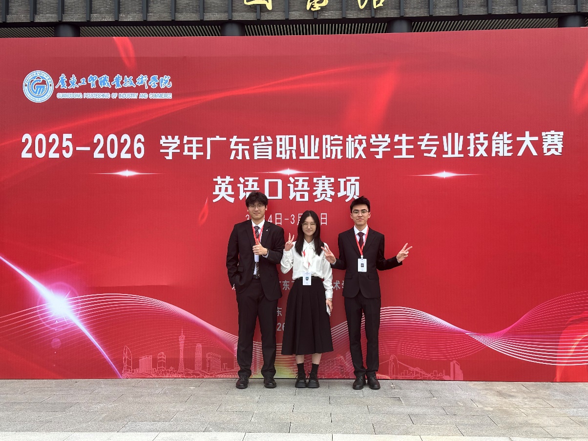 3月15日至16日,由廣東省教育廳主辦的2025-2026年度廣東省職業(yè)院校技能大賽(高職組)英語口語賽項(xiàng)圓滿落幕。本次大賽匯聚全省87所高職院校320余名選手同臺(tái)競技,賽制設(shè)置 “職場描述”“情景交流”及“綜合展示”等模塊,全面考查選手英語應(yīng)用能力與團(tuán)隊(duì)協(xié)作素養(yǎng)。經(jīng)過兩天激烈角逐,我校云浮校區(qū)經(jīng)管學(xué)院劉有為、袁靖宜、吳宇峰(圖1)三名同學(xué)憑借扎實(shí)的語言功底和穩(wěn)定的臨場發(fā)揮,榮獲團(tuán)體三等獎(jiǎng)。