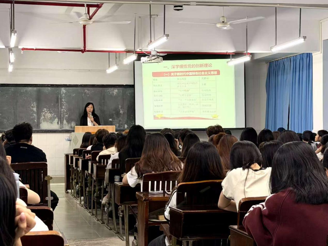講座伊始,劉惠玲書(shū)記首先從理論維度闡釋習(xí)近平新時(shí)代中國(guó)特色社會(huì)主義思想精髓要義,指出新時(shí)代是中華民族從站起來(lái)、富起來(lái)到強(qiáng)起來(lái)的偉大飛躍時(shí)代,中國(guó)特色社會(huì)主義建設(shè)之“強(qiáng)”體現(xiàn)在全方位躍升,勉勵(lì)同學(xué)們?cè)趯W(xué)思踐悟中堅(jiān)定理想信念。解讀“十五五”新發(fā)展征程時(shí),劉書(shū)記帶領(lǐng)師生回顧“十四五”成就,介紹“十五五”規(guī)劃五大原則并闡釋核心內(nèi)容,強(qiáng)調(diào)新質(zhì)生產(chǎn)力是推動(dòng)高質(zhì)量發(fā)展核心動(dòng)力,鼓勵(lì)青年學(xué)子擁抱科技革命、練就過(guò)硬本領(lǐng)。立足廣東實(shí)際,劉書(shū)記回顧了習(xí)近平總書(shū)記對(duì)廣東囑托,稱(chēng)廣東作為改革開(kāi)放前沿,肩負(fù)推進(jìn)中國(guó)式現(xiàn)代化建設(shè)走在前列使命,希望同學(xué)們感悟關(guān)懷,將個(gè)人發(fā)展融入廣東發(fā)展大局。