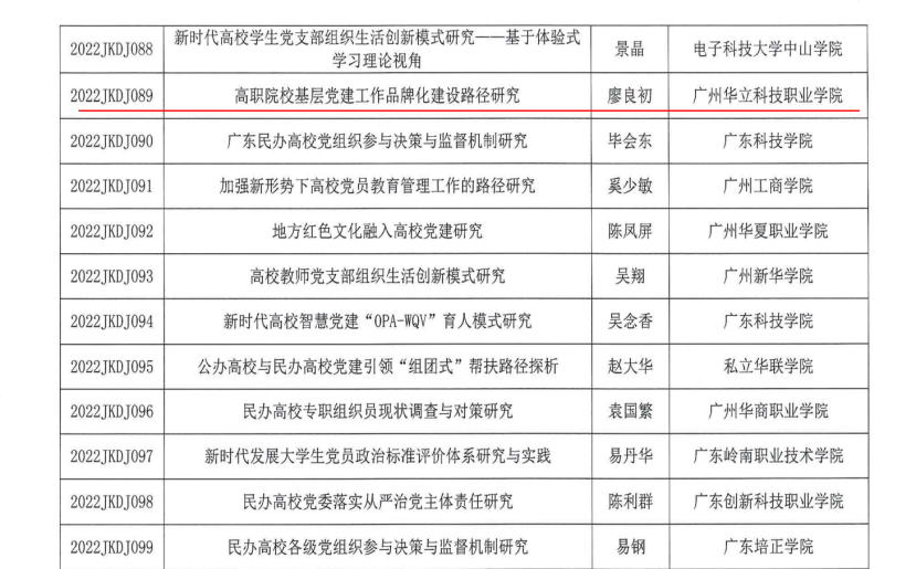 近日,廣東省教育科學(xué)規(guī)劃領(lǐng)導(dǎo)小組辦公室發(fā)布了《關(guān)于2022年度廣東省教育科學(xué)規(guī)劃課題(黨建研究專項(xiàng))立項(xiàng)的通知》,經(jīng)過專家評審、公示和省教育科學(xué)規(guī)劃小組審定等程序,公布了廣東省2022年度課題立項(xiàng)情況,我校馬克思主義學(xué)院廖良初教授、梁國英副教授申報(bào)的課題《高職院校基層黨建工作品牌化建設(shè)路徑研究》獲得立項(xiàng)。項(xiàng)目批準(zhǔn)號為2022JKDJ089。