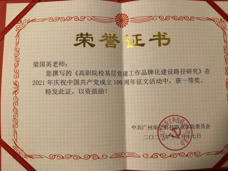 馬克思主義學(xué)院梁國(guó)英老師在2021年慶祝中國(guó)共產(chǎn)黨成立100周年征文活動(dòng)中獲一等獎(jiǎng)