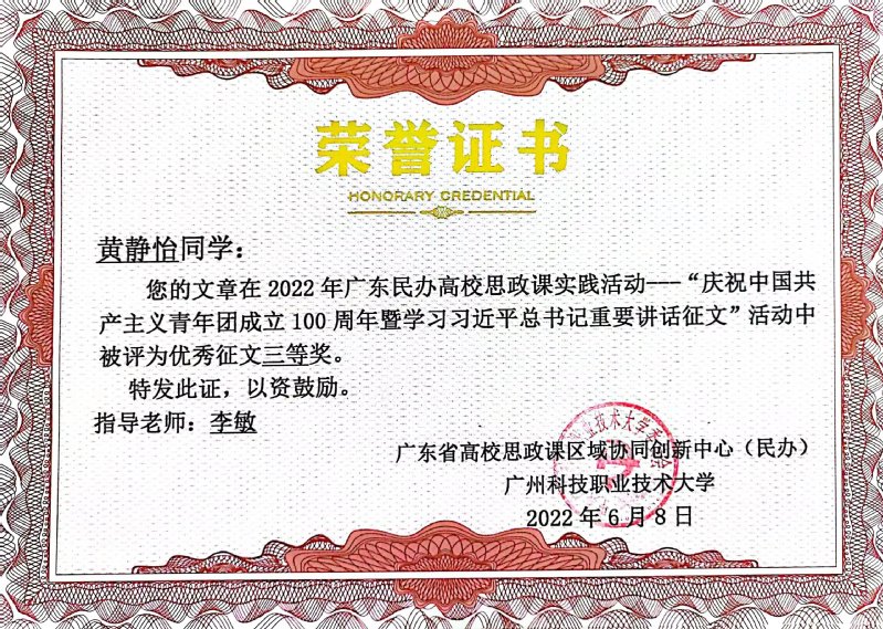 馬克思主義學(xué)院教師李敏指導(dǎo)學(xué)生在建團(tuán)百年征文活動(dòng)中被評為優(yōu)秀征文三等獎(jiǎng)