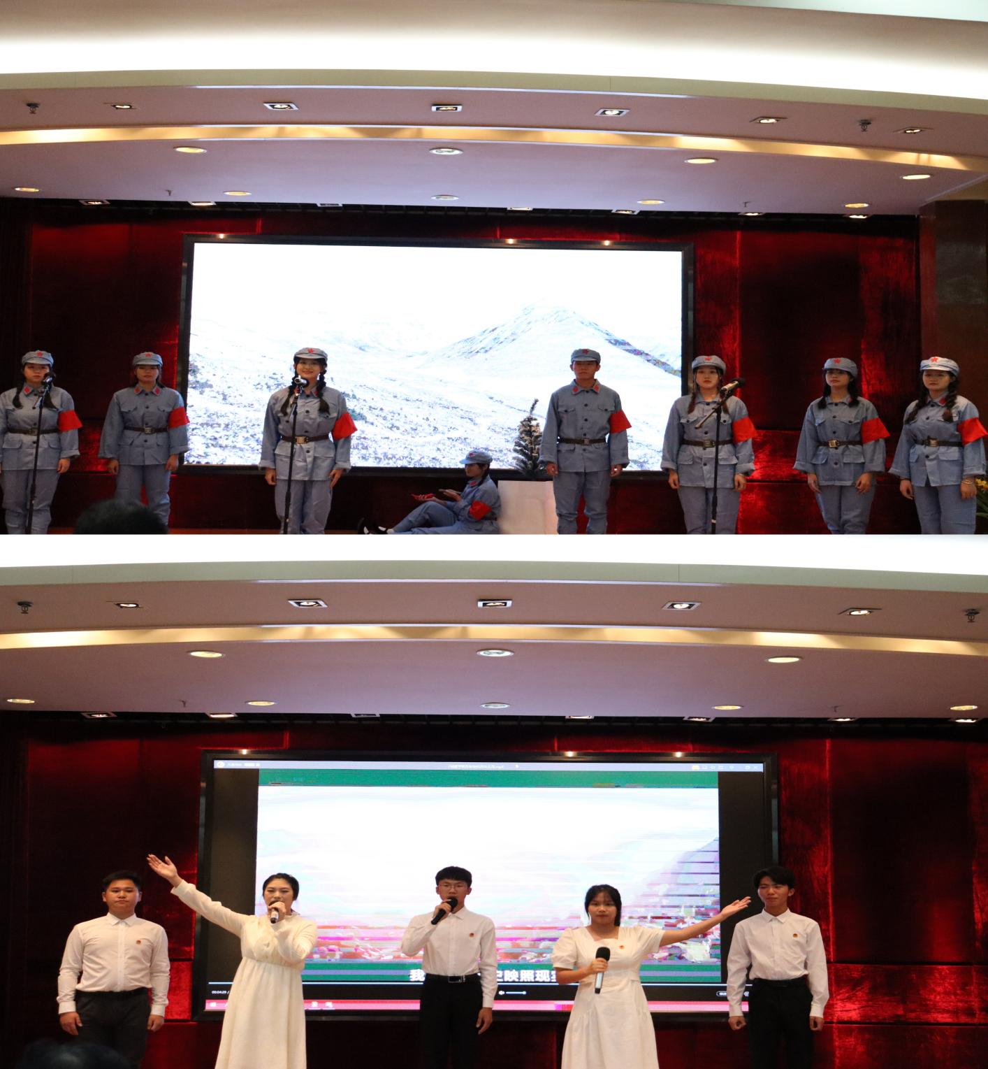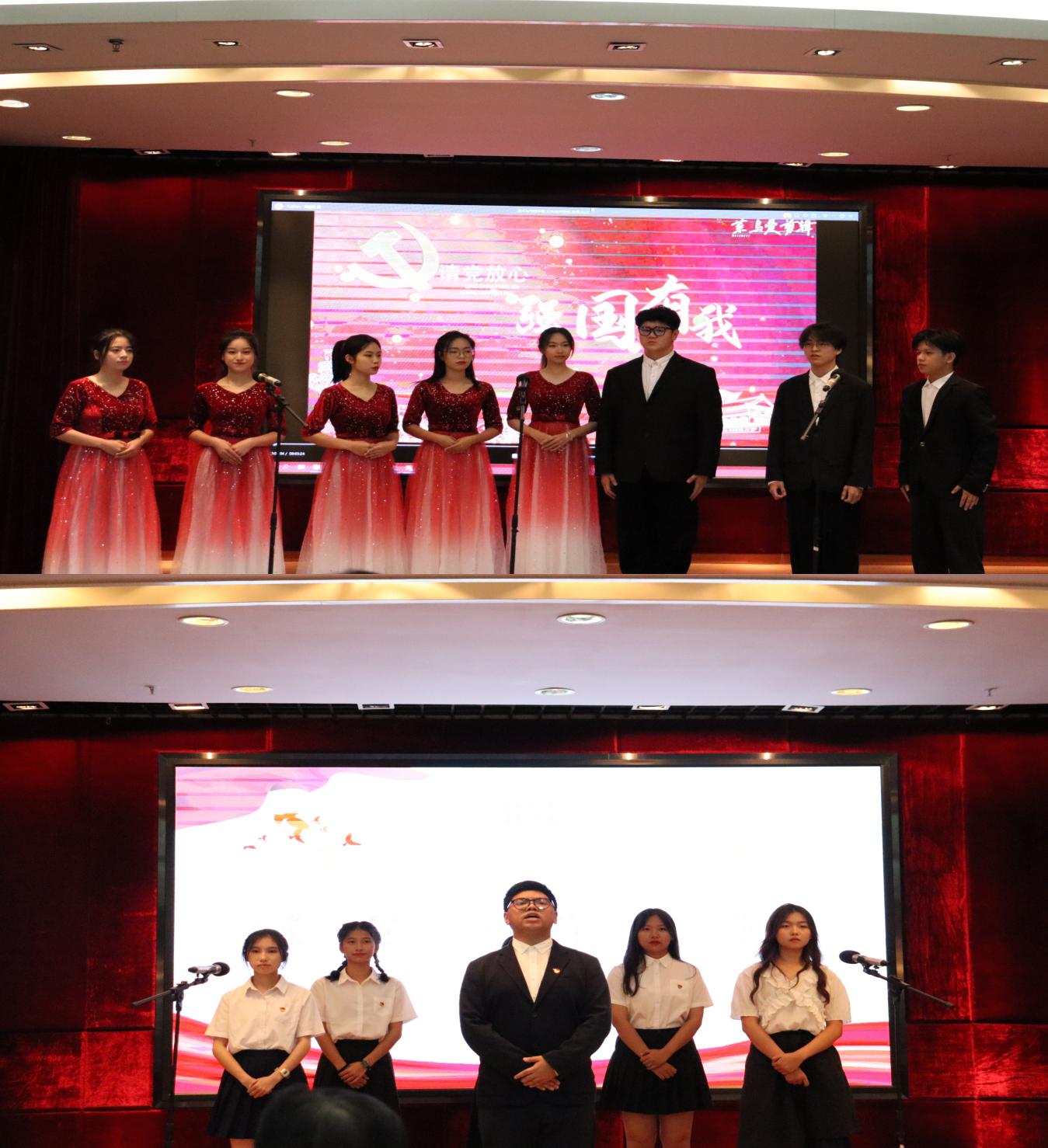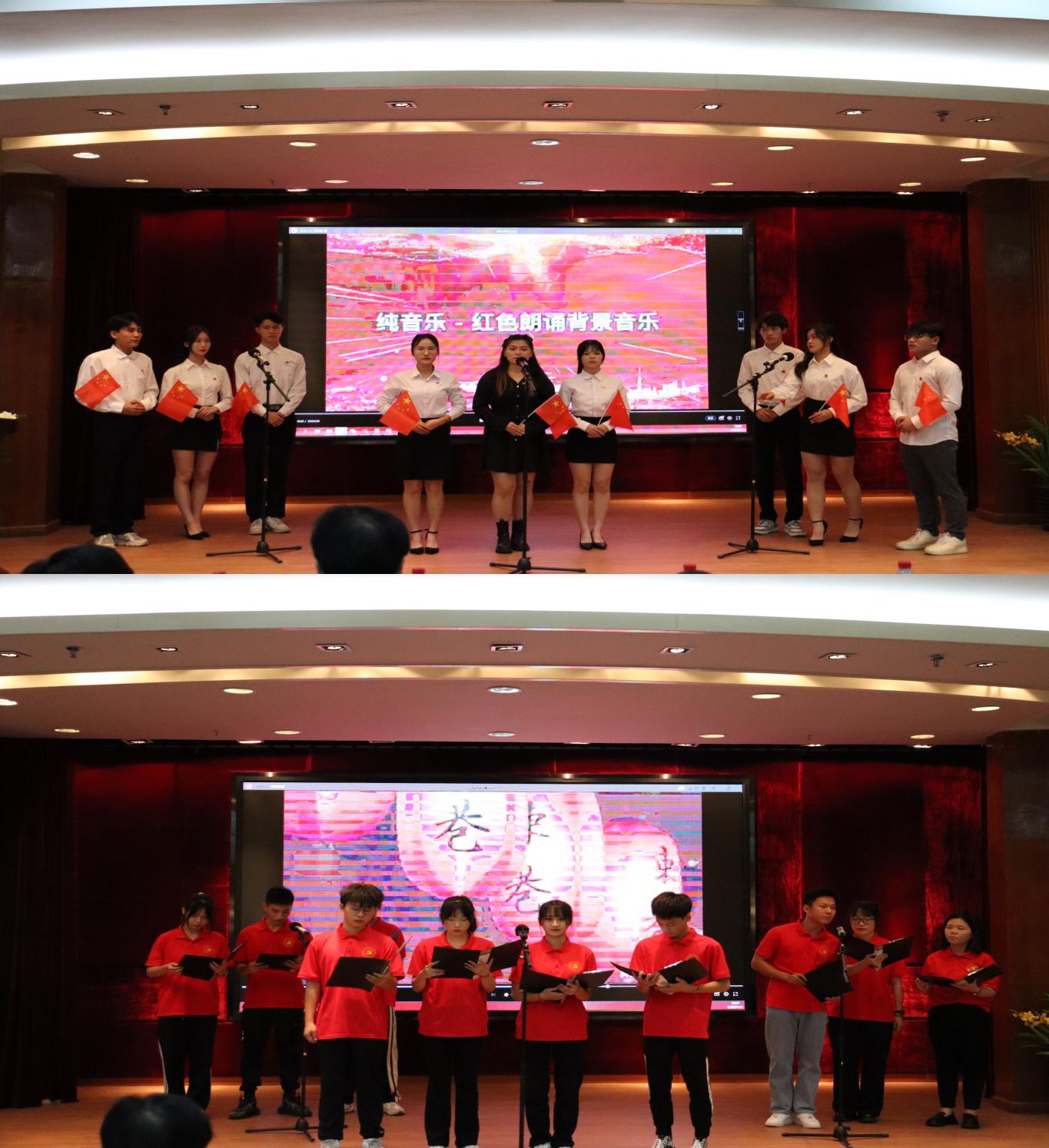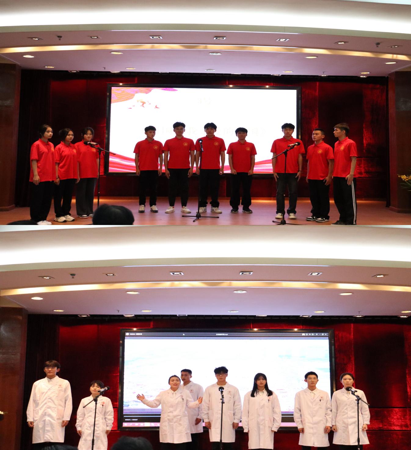 參加比賽的八支隊(duì)伍呈現(xiàn)出精彩生動(dòng)的八個(gè)作品。比賽伊始,財(cái)經(jīng)學(xué)院演繹的《與時(shí)代同向,與祖國(guó)同行》拉開帷幕,在他們的誦讀聲中,讓我們感受到青春炙熱的理想奏響新時(shí)代的青春之歌。接下來,管理學(xué)院《青春跟黨走》誦讀鏗鏘有力,我們是祖國(guó)的希望,我們是中華的棟梁,青年永遠(yuǎn)跟黨走。把青春朝氣蓬勃?dú)庀?/span>完美地詮釋出來了。電力學(xué)院《祖國(guó)啊我親愛的祖國(guó)》,仿佛是在訴說著神州大地動(dòng)人的傳奇。藝術(shù)與傳媒學(xué)院《請(qǐng)黨放心,強(qiáng)國(guó)有我》,極力歌頌了青年的朝氣蓬勃,體現(xiàn)出當(dāng)代中國(guó)青年發(fā)奮圖強(qiáng)的風(fēng)骨。健康學(xué)院《逆光的翅膀》,聚小愛為大愛的天使演繹,護(hù)佑了人世的健康,春風(fēng)重啟,萬物生長(zhǎng),令人震撼。接下來,計(jì)算機(jī)信息工程學(xué)院《有一首歌》、城建學(xué)院《百年恰是風(fēng)華正茂》以及教育學(xué)院《軍禮》讓我們真切感受到了強(qiáng)烈的民族自豪感和歸屬感。絲絲管弦,演不盡中華的流光溢彩;悠悠書生,誦不完黨旗的悠揚(yáng)鏗鏘。