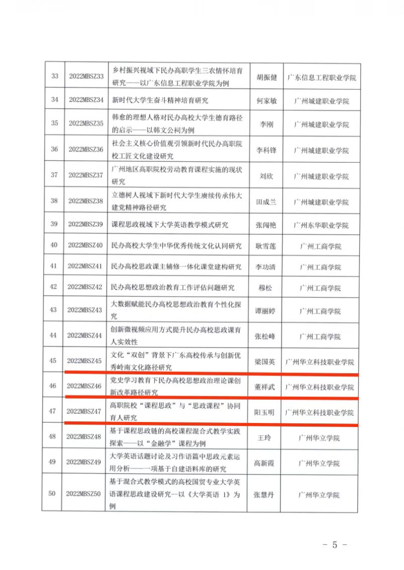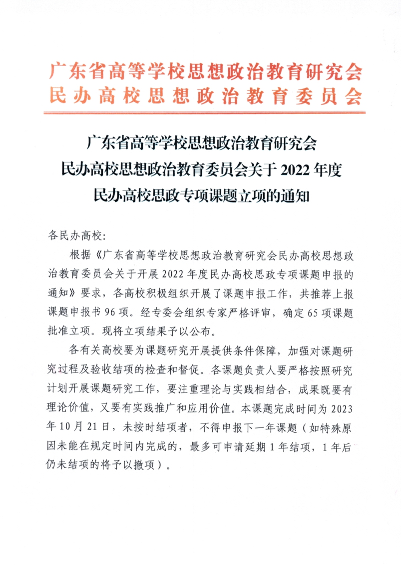 近日,廣東省高等學(xué)校思想政治教育研究會(huì)民辦高校思想政治教育委員會(huì)發(fā)布了關(guān)于2022年度民辦高校思政專項(xiàng)課題立項(xiàng)的通知,經(jīng)各高校積極組織申報(bào),共推薦上報(bào)課題申報(bào)書96項(xiàng)。由各專委會(huì)組織專家嚴(yán)格評(píng)審,確定65項(xiàng)課題批準(zhǔn)立項(xiàng)。我校馬克思主義學(xué)院梁國(guó)英老師、董祥武老師、陽(yáng)玉明老師申報(bào)的課題獲得立項(xiàng),項(xiàng)目批準(zhǔn)號(hào)分別為2022MBSZ45、2022MBSZ46、2022MBSZ47。
