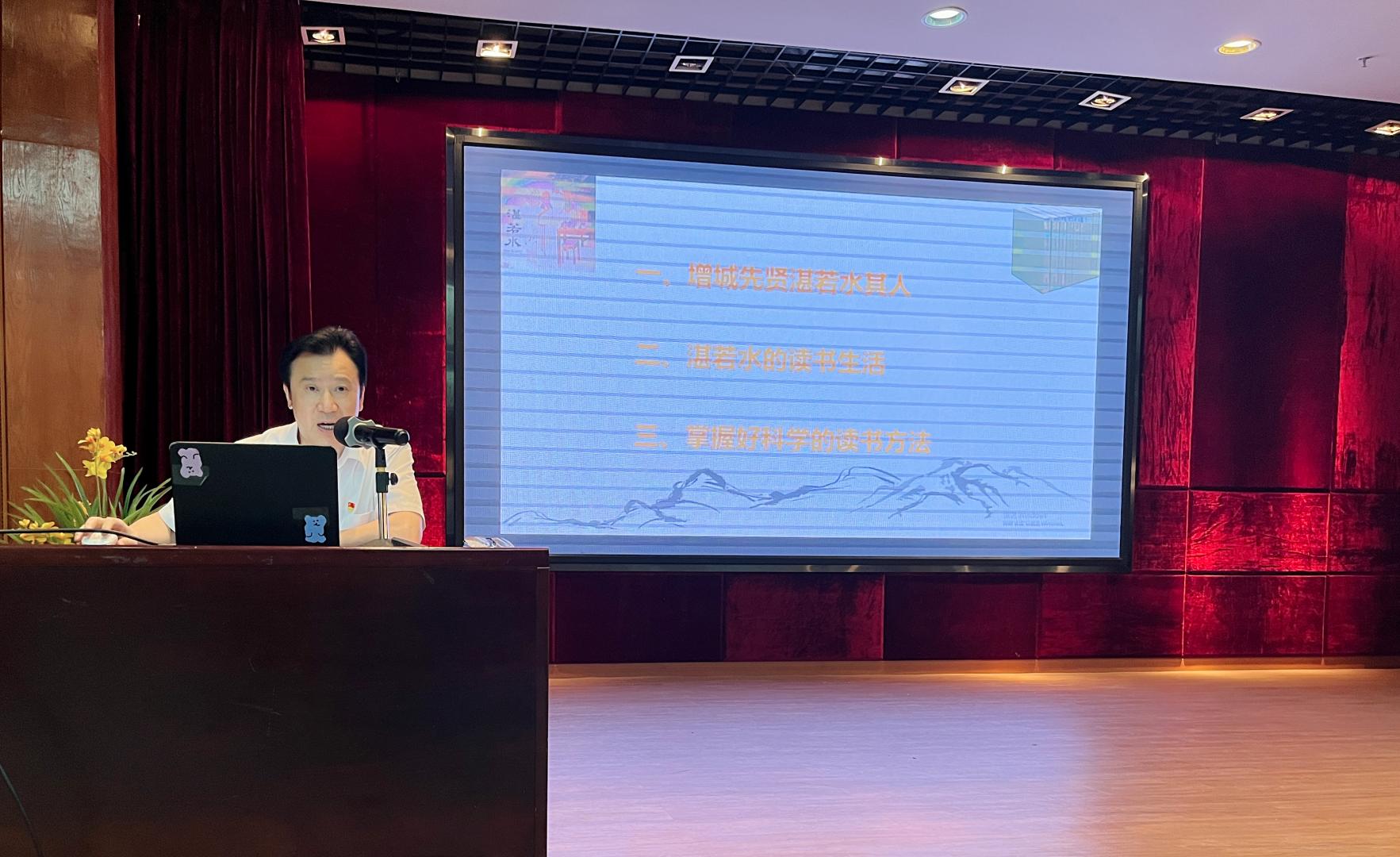 講座上,廖教授詳細(xì)介紹了增城先賢湛若水及他的讀書(shū)生活。湛若水:號(hào)甘泉,明代著名的思想家、哲學(xué)家、政治家、教育家、書(shū)法家和詩(shī)人。他一生從事過(guò)外交、行政、教育等工作,創(chuàng)辦了40多所書(shū)院,撰寫(xiě)著作550多萬(wàn)字,并創(chuàng)立了甘泉學(xué)派,其影響擴(kuò)展到了甘泉文化。湛若水能留芳千古,產(chǎn)生如此巨大影響,不僅是他的官職,更多是他的書(shū)、他的思想、他的精神??v觀湛若水一生:讀書(shū)、寫(xiě)書(shū)、教書(shū)是他的人生主線,大器晚成、苦讀經(jīng)書(shū)、讀而思書(shū)、與人辯論是他的讀書(shū)生活特點(diǎn)。