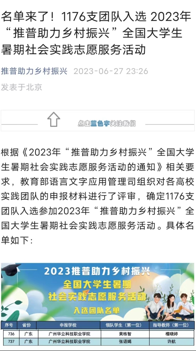 2023年“推普助力鄉(xiāng)村振興”全國大學(xué)生暑期社會(huì)實(shí)踐志愿服務(wù)活動(dòng),經(jīng)全國各大高校申報(bào),教育部、共青團(tuán)中央組織專家廣泛遴選、綜合評審,包括北京大學(xué)、清華大學(xué)、廣東工業(yè)大學(xué)等高校共1176支團(tuán)隊(duì)入選。