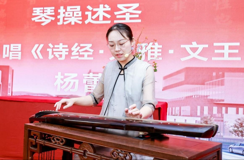 隨后,古琴?gòu)V陵派第十四代傳人、青年藝術(shù)家楊蕾演奏了《弦歌《大雅·文王》,悠揚(yáng)古樸的琴聲為活動(dòng)拉開(kāi)帷幕。而后,眾人一起誦讀了《史記·孔子世家贊》《中庸》里贊頌孔子的經(jīng)典文段,向孔子行敬師禮,進(jìn)獻(xiàn)素花,以此傳揚(yáng)圣人之德,表達(dá)對(duì)孔子的追慕之情。