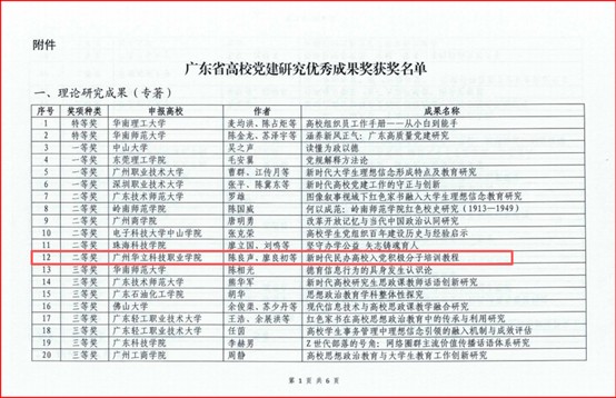 近日,廣東省高等學(xué)校黨的建設(shè)研究會(huì)公布了高校黨建研究優(yōu)秀成果獎(jiǎng)獲獎(jiǎng)名單,全省共有103項(xiàng)成果獲獎(jiǎng),其中民辦高職院校只有3個(gè)項(xiàng)目上榜。我校黨委書記陳良聲、馬克思主義學(xué)院院長廖良初組織思政課教師主編的《新時(shí)代民辦高校入黨積極分子培訓(xùn)教程》榮獲理論研究成果(專著類)二等獎(jiǎng),該獎(jiǎng)項(xiàng)全省共評(píng)出20項(xiàng),我校是該獎(jiǎng)項(xiàng)唯一獲獎(jiǎng)的高職院校。