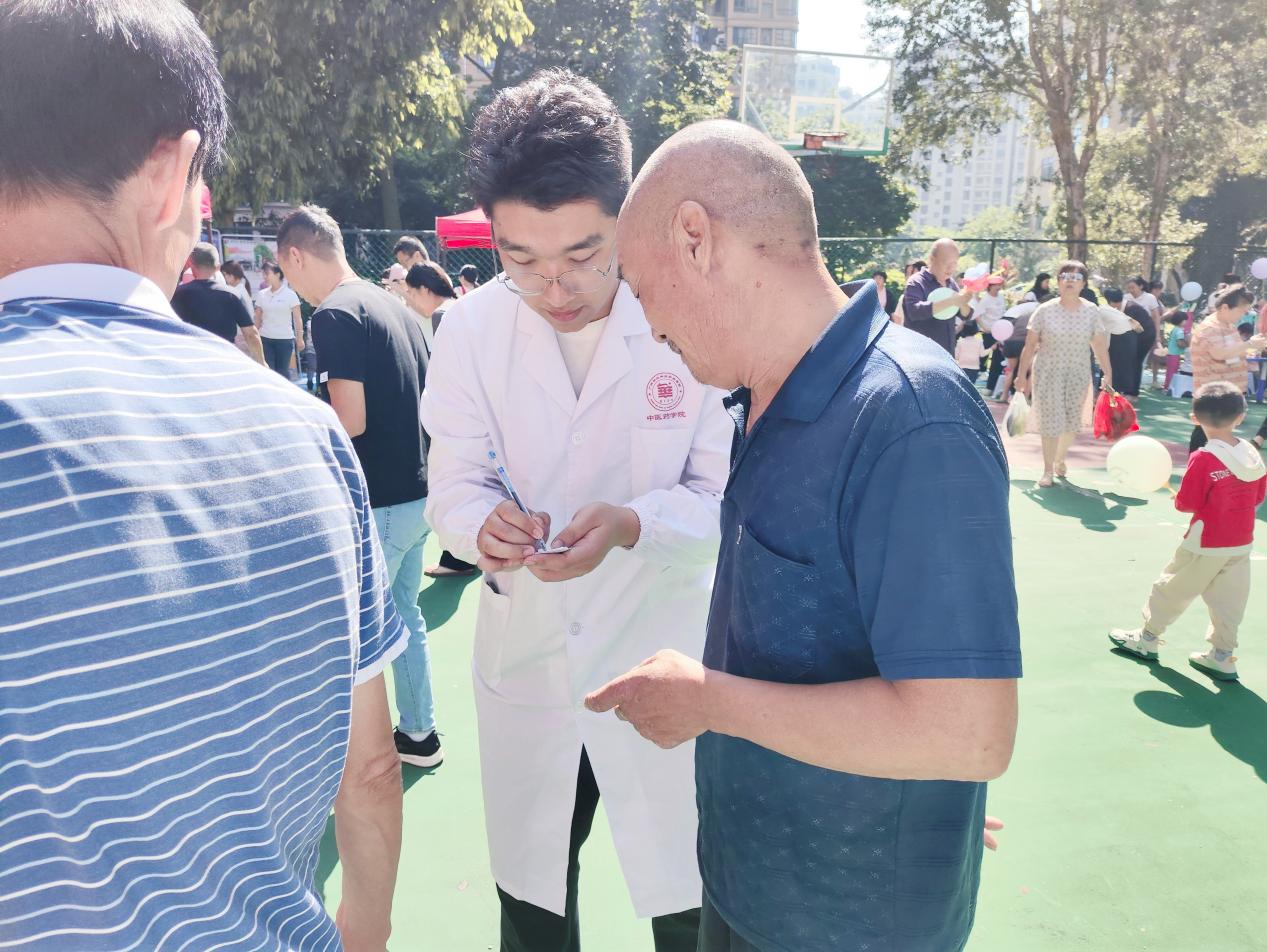 在豪園第二社區(qū)的籃球場上,前來義診的群眾絡繹不絕,活動現(xiàn)場井然有序。志愿者們耐心細致地指引前來義診的居民填信息、排隊、測量血糖血壓,并引導其到健康咨詢區(qū)進行問診咨詢。其中,在中醫(yī)適宜技術體驗區(qū),我院教師薛嘯、歐陽斌嫻熟地為群眾提供針灸、艾灸、推拿等中醫(yī)適宜技術服務,幫助其緩解肩頸酸痛、頭痛等癥狀,不僅獨具特色,深受群眾的喜愛,還弘揚了中醫(yī)藥傳統(tǒng)文化,增強群眾防病和治病的意識。