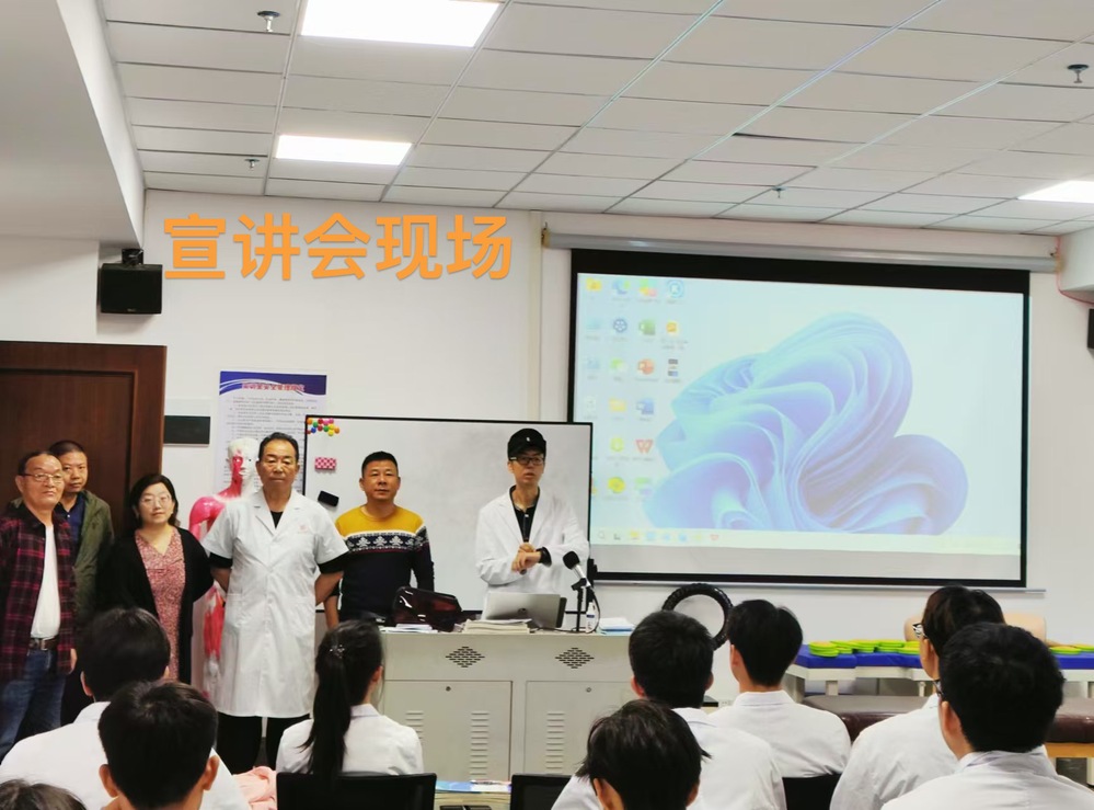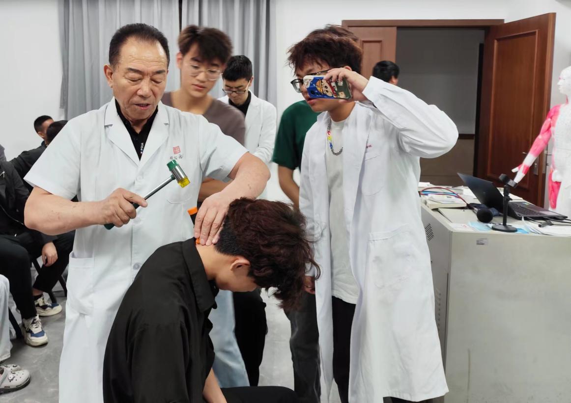 課堂上,代老師系統(tǒng)介紹了中醫(yī)經(jīng)絡、臟腑、穴位理論及其在錘療中的具體運用。治療室里,代老師演示了拍療、錘療等一系列獨門手法。通過現(xiàn)場的教學、交流、分享與互動,中醫(yī)學子們認識了頸肩腰腿疼痛及其病因病理,以及勾肩駝背所帶來的種種危害,從而感受了中醫(yī)的神奇,體驗了錘療的魅力,心理上已隱然向“準理療師”轉變。