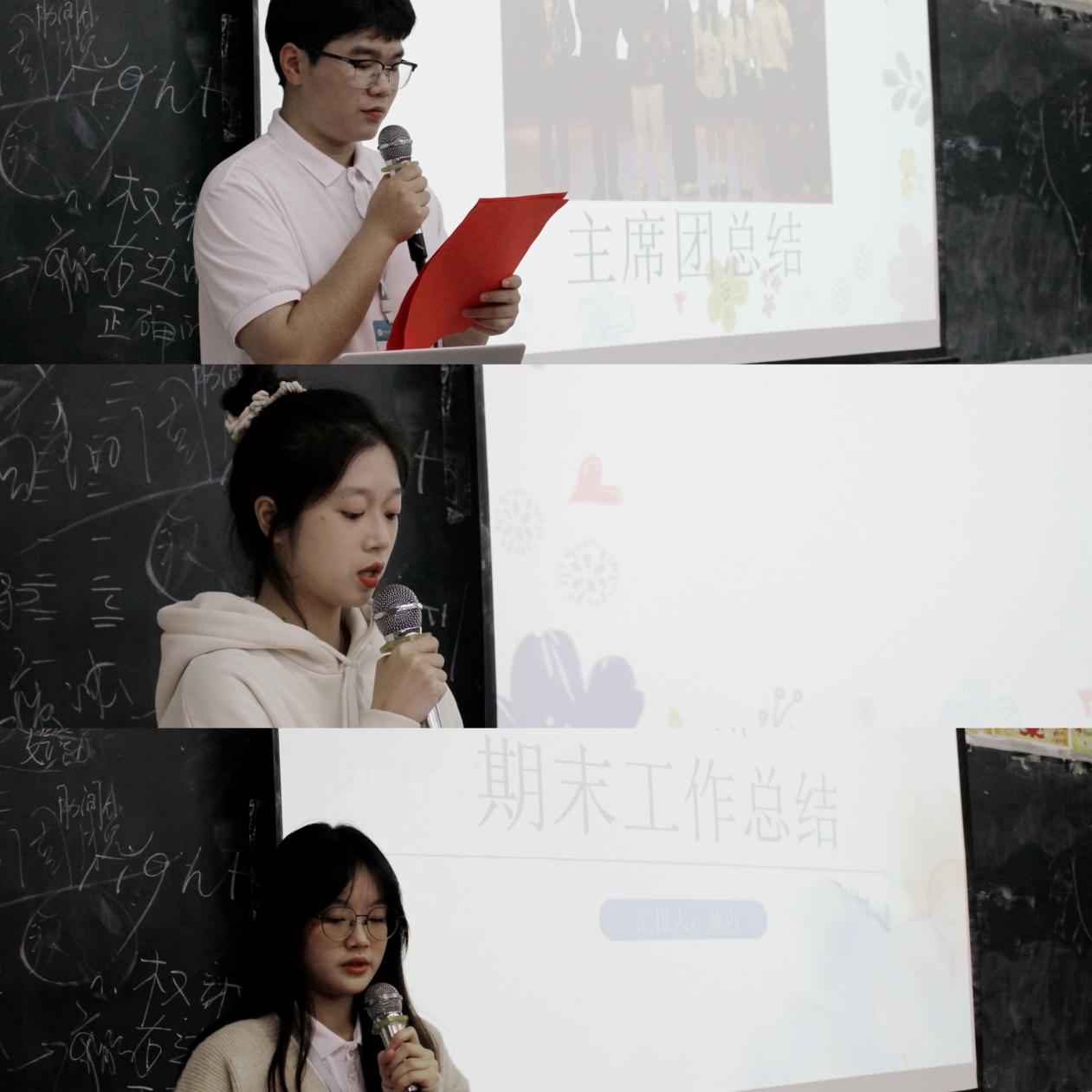 首先,各部門部長分別對(duì)本學(xué)期開展的工作進(jìn)行回顧,各部門在各司其職、互相幫助、默契配合中順利完成了各項(xiàng)工作。其次,對(duì)開展的一系列活動(dòng)進(jìn)行了總結(jié)與反思,提出了存在的不足。最后對(duì)下學(xué)期的的工作進(jìn)行了規(guī)劃和展望。在各部長發(fā)言后學(xué)生會(huì)展開了期末表彰大會(huì),對(duì)于本學(xué)期優(yōu)秀干部與干事進(jìn)行表彰合影。