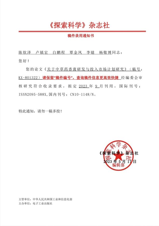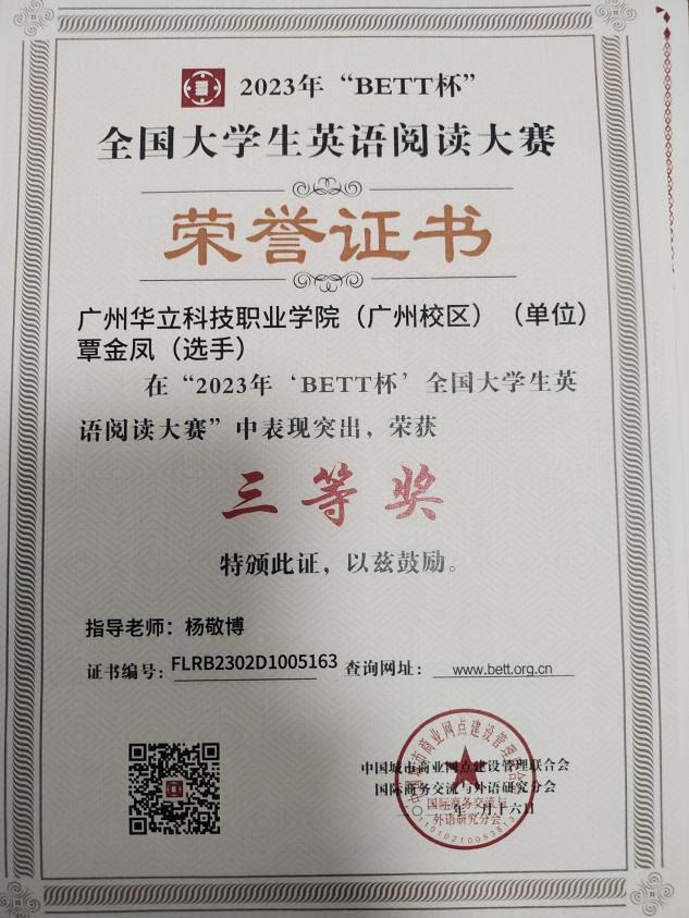 此外,她特別關(guān)注各類競賽,注重提升自身對知識的應(yīng)用和轉(zhuǎn)化能力,全面發(fā)展自己,努力成為一名綜合素養(yǎng)高的大學(xué)生。她參與的創(chuàng)新創(chuàng)業(yè)項目《醫(yī)香情苑——關(guān)于中草藥香膏研發(fā)與投入市場計劃》在第二屆贏在廣州校賽中獲得了一等獎,并以第四作者的身份在《探索科學(xué)》上發(fā)表了論文《關(guān)于中草藥香膏研發(fā)與投入市場研究》。為了能夠鞭策自己學(xué)習(xí)英語,她還積極參加各項英語競賽,在2023年“中外傳播杯”全國大學(xué)生英語詞匯大賽中獲得了高職高專組三等獎,共計獲得英語類競賽獎項6個。不管是網(wǎng)絡(luò)知識競賽,還是校園內(nèi)舉辦的各項技能比賽,只要能夠進入到她的視野中,她都積極參與并獲得了許多獎項。
