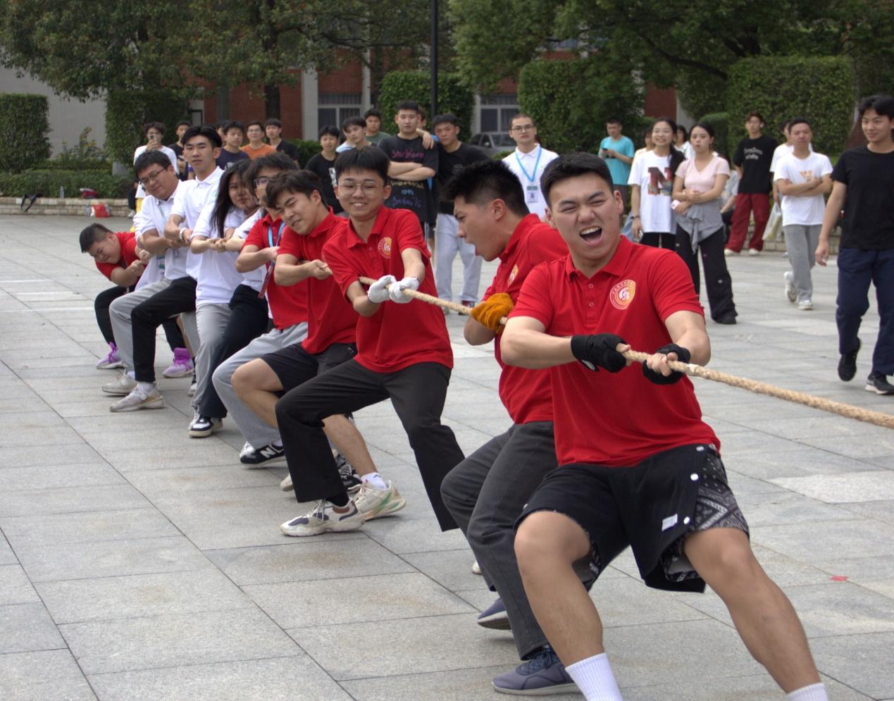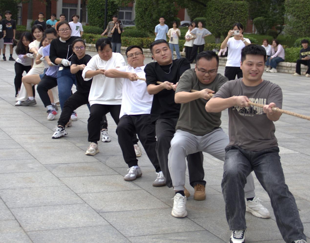 教師代表隊(duì)以學(xué)院為單位抽簽進(jìn)行分組,組成了一支支斗志昂揚(yáng)的參賽隊(duì)伍與學(xué)生進(jìn)行了師生友誼賽。比賽開(kāi)始前,各隊(duì)員進(jìn)行了充分的熱身運(yùn)動(dòng),摩拳擦掌,蓄勢(shì)待發(fā)。隨著裁判的一聲哨響,比賽正式拉開(kāi)帷幕。他們緊握長(zhǎng)繩,咬緊牙關(guān),全力以赴地往后拉。觀眾們則在一旁吶喊助威,加油聲此起彼伏,為比賽增添了濃厚的氛圍。
