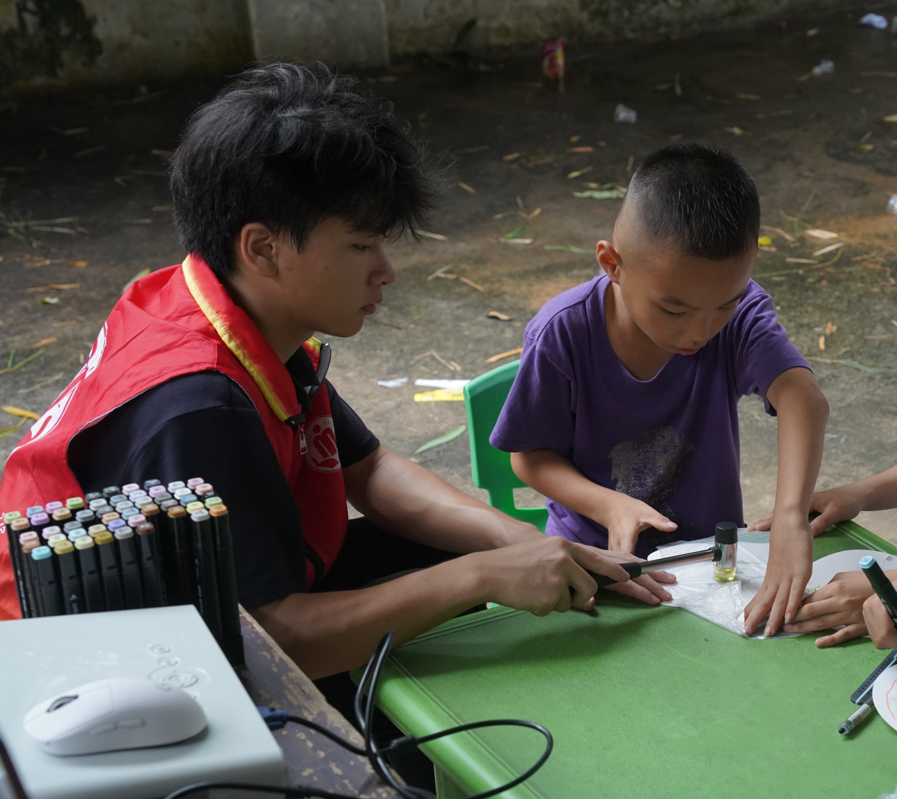 課程結(jié)束后,突擊隊(duì)員們開展了植物拓印活動,突擊隊(duì)員們帶領(lǐng)小朋友將提前處理好的植物使用橡膠錘將其汁液錘出,印在紙扇子上,并用畫筆畫上生動的圖案,制作出了富有童趣且豐富多彩的作品,現(xiàn)場氣氛熱烈,歡聲笑語此起彼伏。