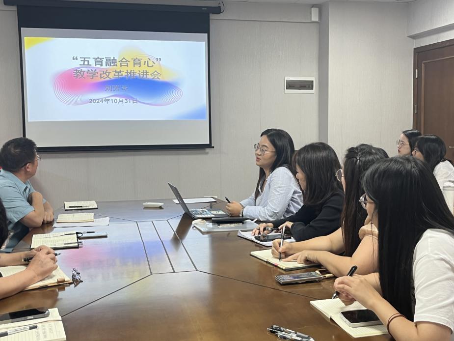 校辦劉芳岑老師分享了“五育融合育心”教學(xué)改革工作推進的指導(dǎo)思想,以“心理+知識+品德”為教學(xué)目標和通過五育與心育的交叉融合教學(xué)為改革目標,主要思路和培訓(xùn)計劃,與學(xué)院教師進行了探討,并為進一步工作作了計劃。