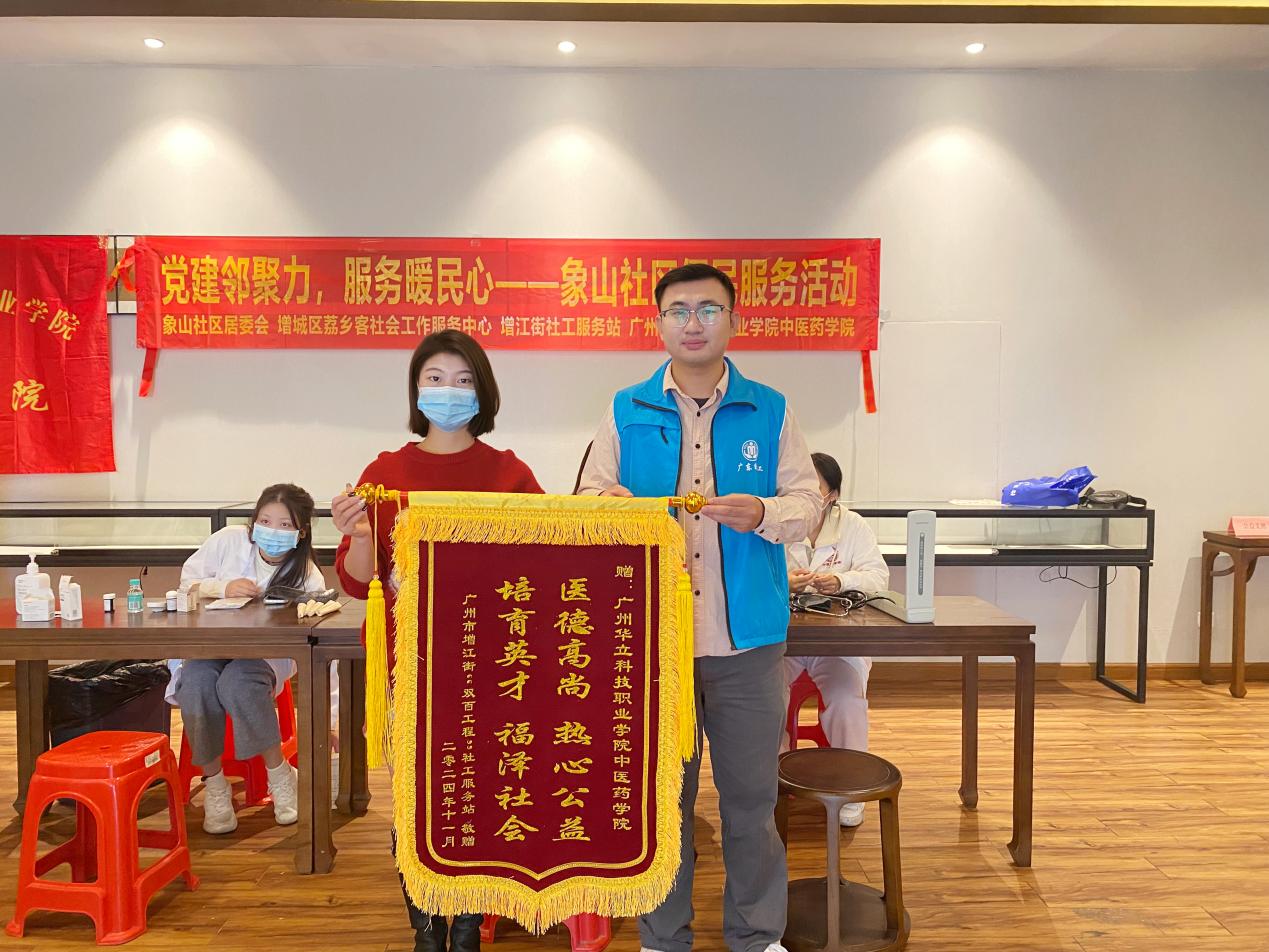 活動(dòng)最后,增江街社工站贈(zèng)予我院錦旗,希望雙方能夠繼續(xù)加強(qiáng)合作,打造群眾健康加油站,將為群眾辦實(shí)事落實(shí)到實(shí)處。學(xué)院也將繼續(xù)堅(jiān)持黨建引領(lǐng),錨定高質(zhì)量發(fā)展落腳點(diǎn),推動(dòng)與周邊社區(qū)及企事業(yè)單位黨建結(jié)對(duì)共建,為居民提供高質(zhì)量的健康服務(wù),助力學(xué)院與社區(qū)的高質(zhì)量發(fā)展。
