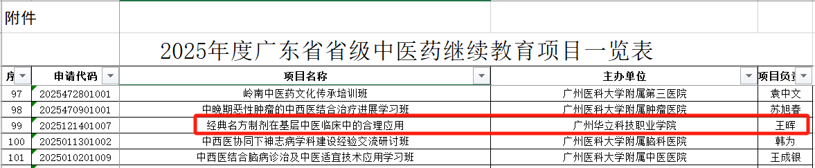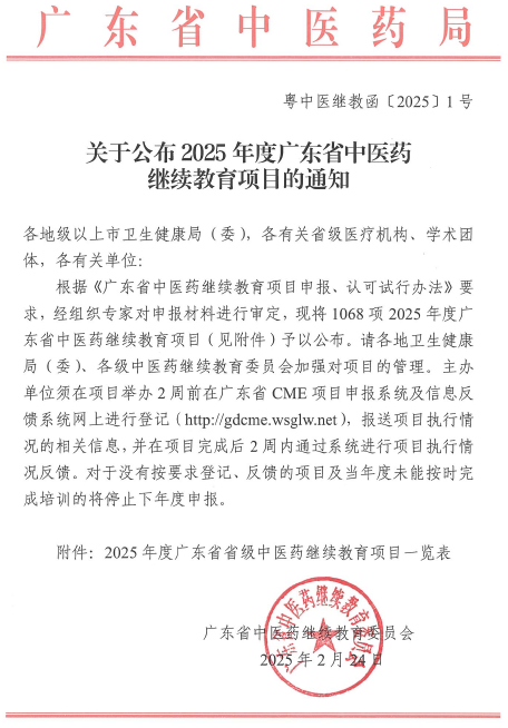 2025年2月25日,由潘菽弢博士起草申報的《經(jīng)典名方制劑在基層中醫(yī)臨床中的合理應(yīng)用》成功入選2025年廣東省中醫(yī)藥繼續(xù)教育項目(CME)。這是我校首次獲得此類繼續(xù)教育項目舉辦資格。