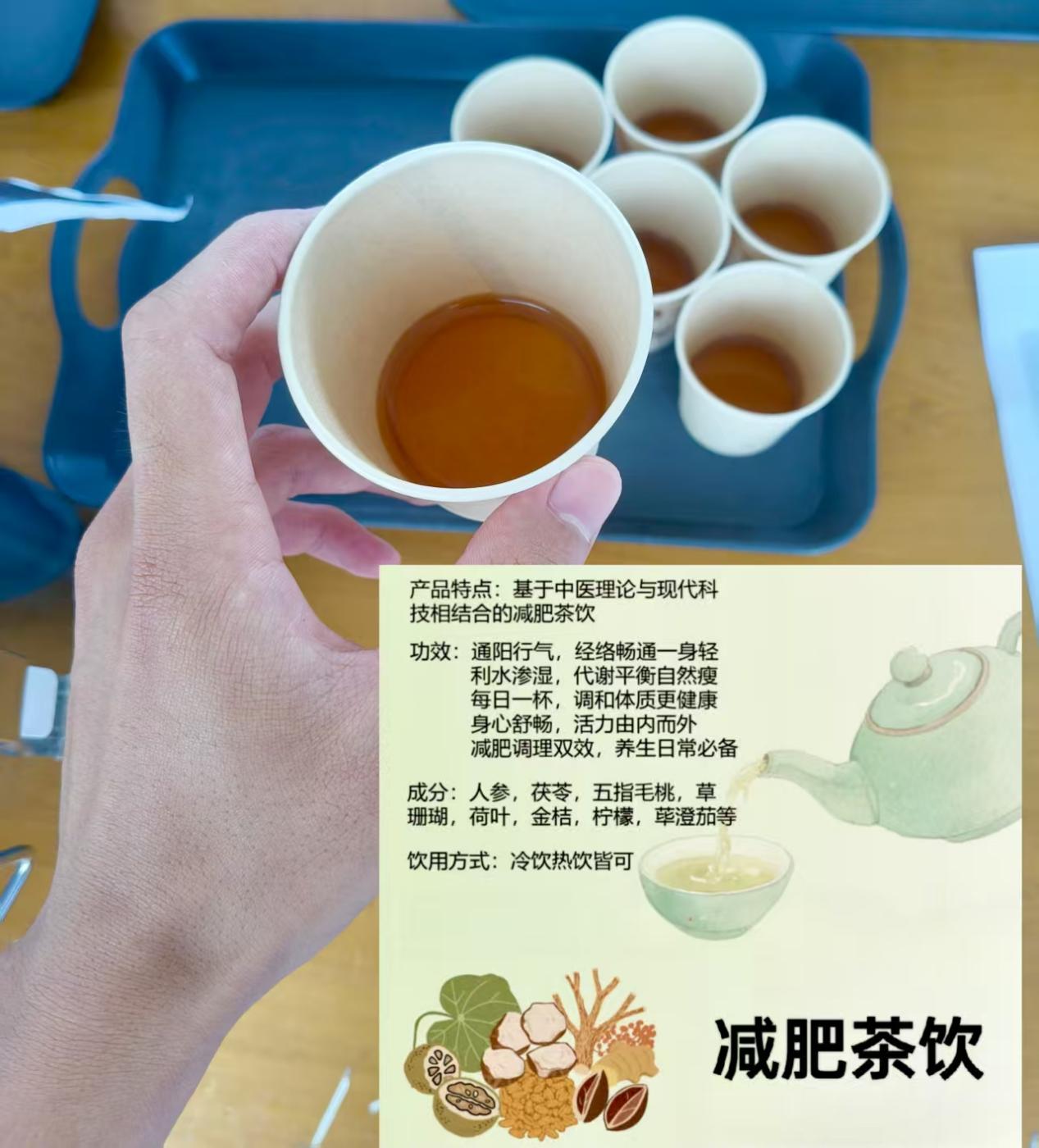 本次活動圍繞中醫(yī)藥學(xué)院推出的嶺南特色本草減肥茶展開。該產(chǎn)品是中醫(yī)藥學(xué)院潘菽弢博士帶領(lǐng)大創(chuàng)團(tuán)隊“本草嶺纖”,在自己之前熱銷的減肥茶配方基礎(chǔ)上,歷經(jīng)數(shù)十次試驗優(yōu)化升級而成。與原配方相比,該款產(chǎn)品不僅增添了砂仁、五指毛桃等富有嶺南特色的本草品類,更將潘博士運用仲景經(jīng)方治療痰飲水濕的臨床經(jīng)驗融入了配伍思路之中。此次在開展全校范圍的試喝體驗與問卷調(diào)查,一方面是給該款產(chǎn)品的口味和香型“定調(diào)”,另一方面就是為開展肥胖志愿者參與的減肥效果對照試驗做準(zhǔn)備。