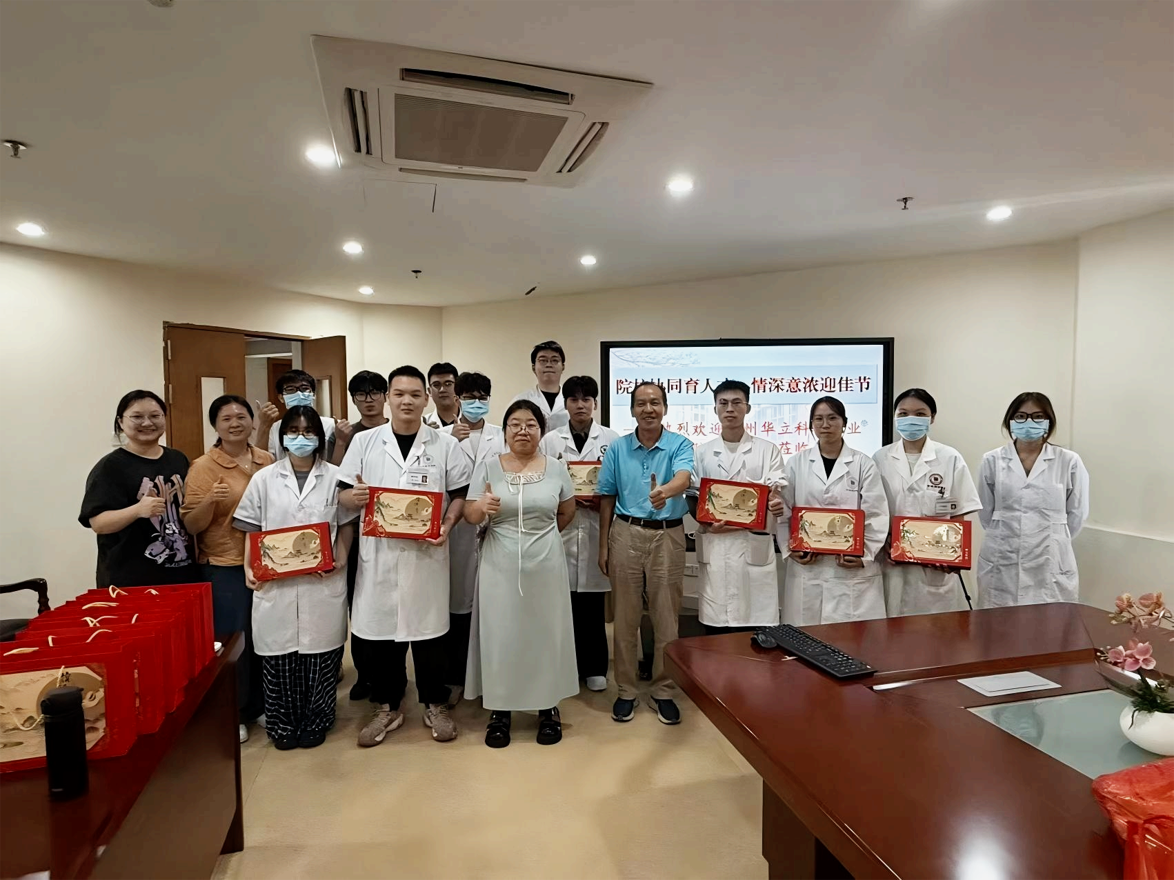 座談會(huì)在溫馨的節(jié)日祝福中結(jié)束。會(huì)后,學(xué)院領(lǐng)導(dǎo)親自將象征著團(tuán)圓與美滿的中秋月餅和水果禮盒送到每一位學(xué)子手中。緊接著,全體人員合影,記錄下這充滿關(guān)懷與期望的時(shí)刻。此次慰問,不僅驅(qū)散了學(xué)子們的思鄉(xiāng)之情,更堅(jiān)定了他們的從醫(yī)信念,也為院校合作的深化寫下了濃墨重彩的一筆。