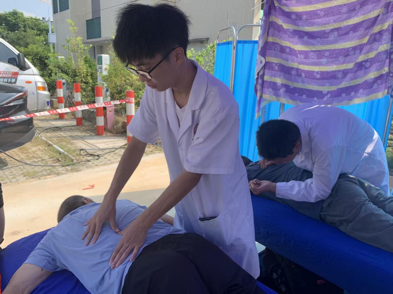 活動(dòng)現(xiàn)場(chǎng),醫(yī)療團(tuán)隊(duì)以飽滿的熱情與專(zhuān)業(yè)的態(tài)度投入服務(wù),迅速搭建起健康咨詢與理療服務(wù)專(zhuān)區(qū),吸引了眾多鄉(xiāng)鎮(zhèn)居民前來(lái)參與。潘菽弢博士憑借深厚的中醫(yī)理論功底與豐富的臨床經(jīng)驗(yàn),為居民們提供一對(duì)一健康咨詢服務(wù)。與此同時(shí),我院中醫(yī)藥應(yīng)用研究所講師團(tuán)與黨建小組的志愿者同學(xué)們充分發(fā)揮專(zhuān)業(yè)所長(zhǎng),為居民提供專(zhuān)業(yè)的推拿理療服務(wù)。面對(duì)患有頸肩腰腿痛的居民,志愿者們運(yùn)用嫻熟的推拿手法,精準(zhǔn)緩解肌肉緊張與疼痛,在服務(wù)過(guò)程中還向居民講解日常護(hù)腰、護(hù)頸的小技巧,幫助居民掌握自我保健方法。