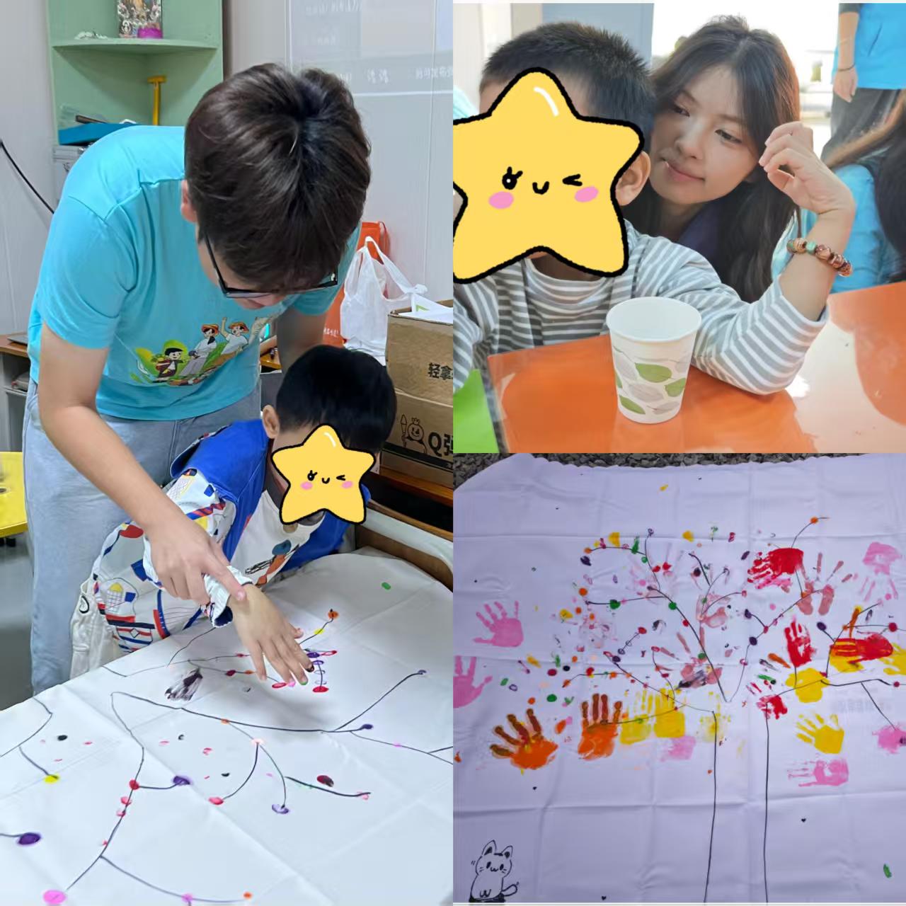 活動(dòng)圍繞“感官藝術(shù),與愛(ài)同行”和“星寶閑置,愛(ài)與交換”兩大主題展開(kāi),通過(guò)富有創(chuàng)意的形式,為自閉癥兒童及其家庭提供專(zhuān)業(yè)支持與情感溫暖。在“感官藝術(shù),與愛(ài)同行”環(huán)節(jié),志愿者們?cè)O(shè)計(jì)了豐富的感官訓(xùn)練內(nèi)容:孩子們?cè)凇缎腋E氖指琛返臍g快旋律中完成拍手、跺腳等感統(tǒng)訓(xùn)練;通過(guò)手工串珠鍛煉手眼協(xié)調(diào)能力;更用手印創(chuàng)作出獨(dú)一無(wú)二的“手印樹(shù)”,實(shí)現(xiàn)視覺(jué)與動(dòng)作的協(xié)同發(fā)展。這些活動(dòng)不僅有效促進(jìn)了孩子們的感官統(tǒng)合能力,也在潛移默化中提升了他們的認(rèn)知與學(xué)習(xí)水平。