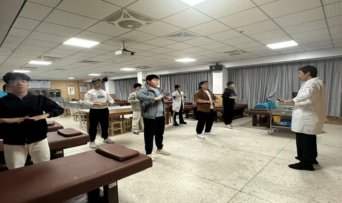 這支隊伍是我院應大會協(xié)辦單位之一—荔港國醫(yī)館袁健強館長之邀而組建的。潘菽弢博士通過其主持的“亦生亦師”項目化課程,先給講師與學徒團隊傳授了袁館長的“一指通”脊柱保健操,該團隊學會該操后再傳授給新加入表演隊的同學。雖然任務緊急,但“亦生亦師”團隊經(jīng)過一學期磨合,不僅積累了一些脊柱保健知識,更形成了較高的學習效率和動手能力,因此在短短兩天內(nèi)即熟練掌握了這套保健操。