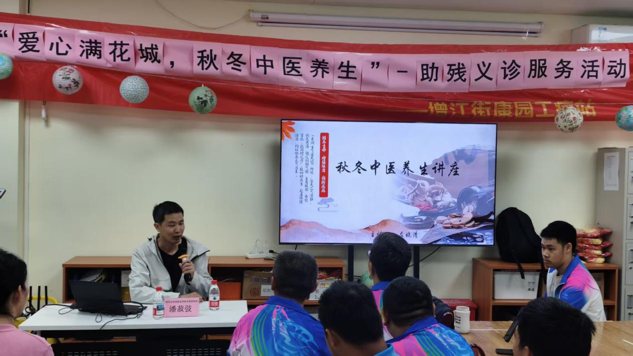 活動(dòng)伊始,學(xué)院潘菽弢博士以“秋冬中醫(yī)養(yǎng)生”為主題開展宣講,結(jié)合季節(jié)特點(diǎn)與殘障群體的身體狀況,向?qū)W員講解公共衛(wèi)生健康知識(shí),增強(qiáng)學(xué)員的健康意識(shí),還通過現(xiàn)場問答與學(xué)員互動(dòng),幫助大家樹立科學(xué)的健康觀念。