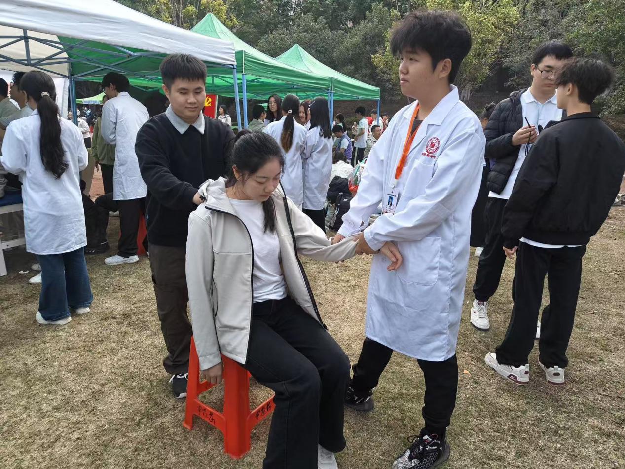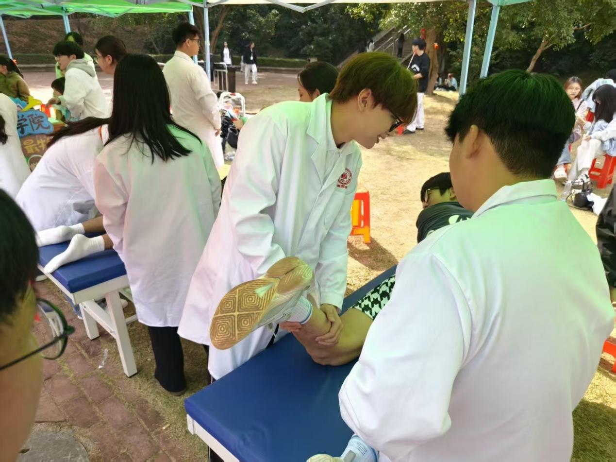 活動(dòng)現(xiàn)場(chǎng),師生團(tuán)隊(duì)化身“健康導(dǎo)師”,結(jié)合日常健康需求,現(xiàn)場(chǎng)演示推拿、針灸等中醫(yī)藥基礎(chǔ)理療手法。演示過程中,老師們細(xì)致講解人體常用穴位的定位、按摩力度操作要點(diǎn),通過“理論+實(shí)操”的方式,將專業(yè)的中醫(yī)藥知識(shí)轉(zhuǎn)化為通俗易懂的講解,手把手指導(dǎo)參與者上手體驗(yàn),耐心解答大家關(guān)于肩頸放松、運(yùn)動(dòng)后康復(fù)等常見問題。此次互動(dòng)教學(xué)讓參與者直觀感受到中醫(yī)藥文化的獨(dú)特魅力與實(shí)用價(jià)值,不僅系統(tǒng)掌握了日常運(yùn)動(dòng)康復(fù)、肩頸舒緩的簡(jiǎn)易理療技巧,提升了自我健康管理能力,更在親身體驗(yàn)中加深了對(duì)傳統(tǒng)醫(yī)學(xué)的認(rèn)知與認(rèn)同,進(jìn)一步推動(dòng)了中華優(yōu)秀傳統(tǒng)醫(yī)學(xué)文化在校園的傳承與發(fā)展。
