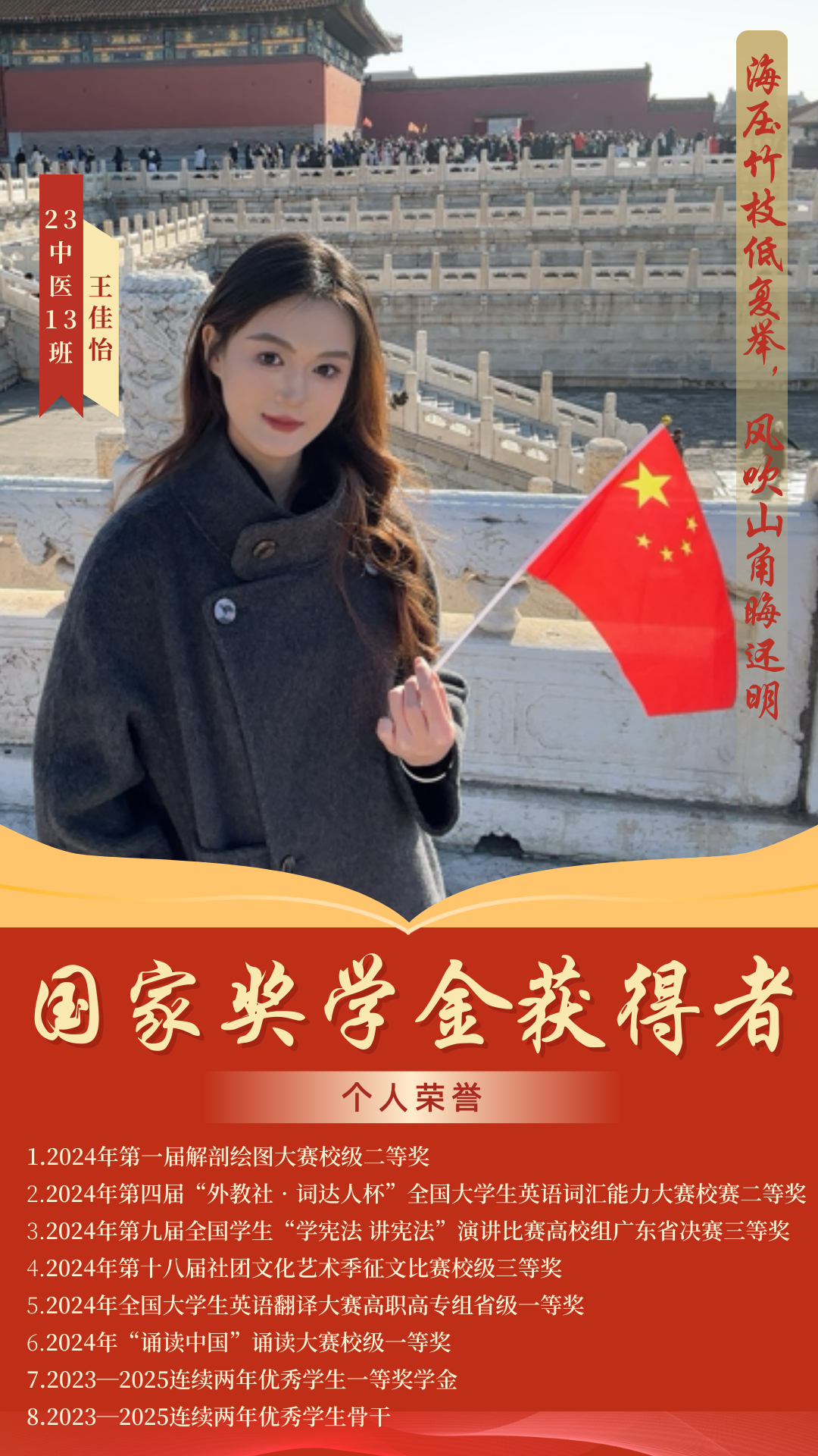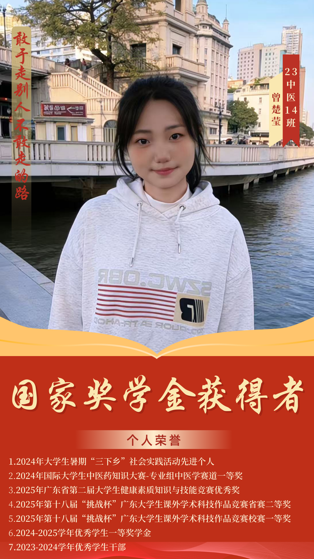 杏林綻芳華,巾幗競風流。在2024-2025學年國家獎學金評選中,我院四名優(yōu)秀學子憑借扎實的專業(yè)素養(yǎng)、勤勉的治學態(tài)度和卓越的綜合表現(xiàn)脫穎而出,成功斬獲國家獎學金,用青春實績詮釋了中醫(yī)藥學子篤學求真、礪行致遠的優(yōu)良風貌。榜樣力量催人奮進,青春風采薪火相傳。今天,讓我們一同走近這四位優(yōu)秀的巾幗學子,聆聽她們深耕杏林、逐夢前行的奮斗故事,汲取榜樣力量,感悟青春擔當,在傳承中醫(yī)藥薪火的道路上攜手奮進、共譜華章。