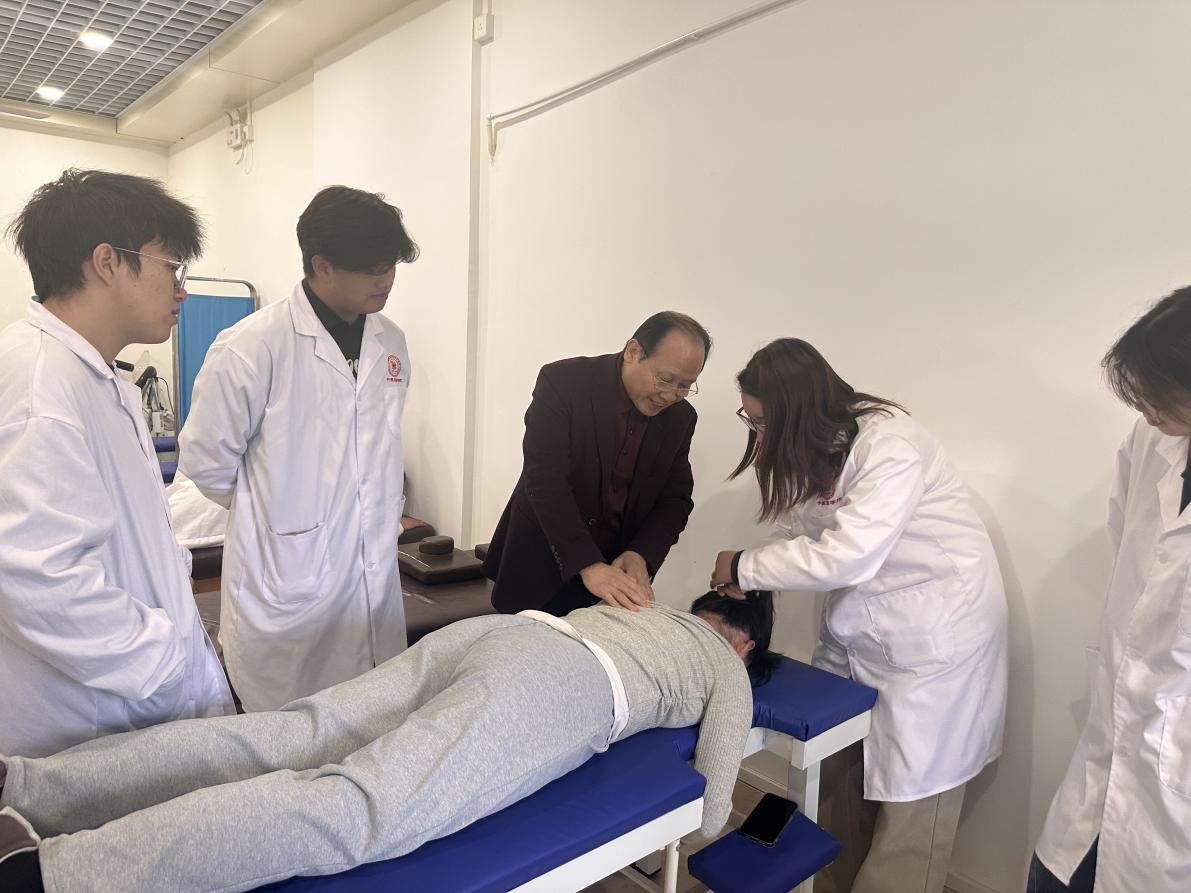 座談會后,兩位專家前往中醫(yī)藥學(xué)院義診活動室考察,觀摩學(xué)生推拿實操展示,并開展針對性指導(dǎo)。袁健強先生結(jié)合臨床經(jīng)驗點評學(xué)生手法與穴位精準度,示范“一指通脊柱推拿療法”并闡釋“辨證施治、剛?cè)岵崩砟?;陳國偉先生建議強化理論與臨床場景融合,提升服務(wù)的針對性與實操效能。