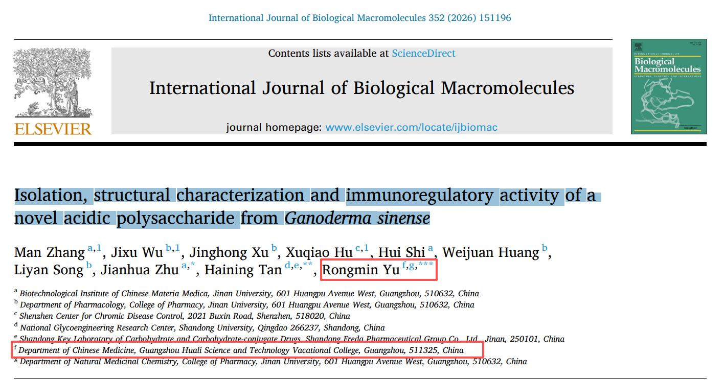 近日,我校中醫(yī)藥學(xué)院于榮敏教授團(tuán)隊(duì)的學(xué)術(shù)研究取得重要進(jìn)展,其題為《Isolation, structural characterization and immunoregulatory activity of a novel acidic polysaccharide from Ganoderma sinense》的論文,以廣州華立科技職業(yè)學(xué)院為第一單位、于榮敏教授為第一通訊作者,在國(guó)際權(quán)威期刊《International Journal of Biological Macromolecules》正式發(fā)表。這一成果標(biāo)志著我校在中藥天然產(chǎn)物研究領(lǐng)域取得重要突破。