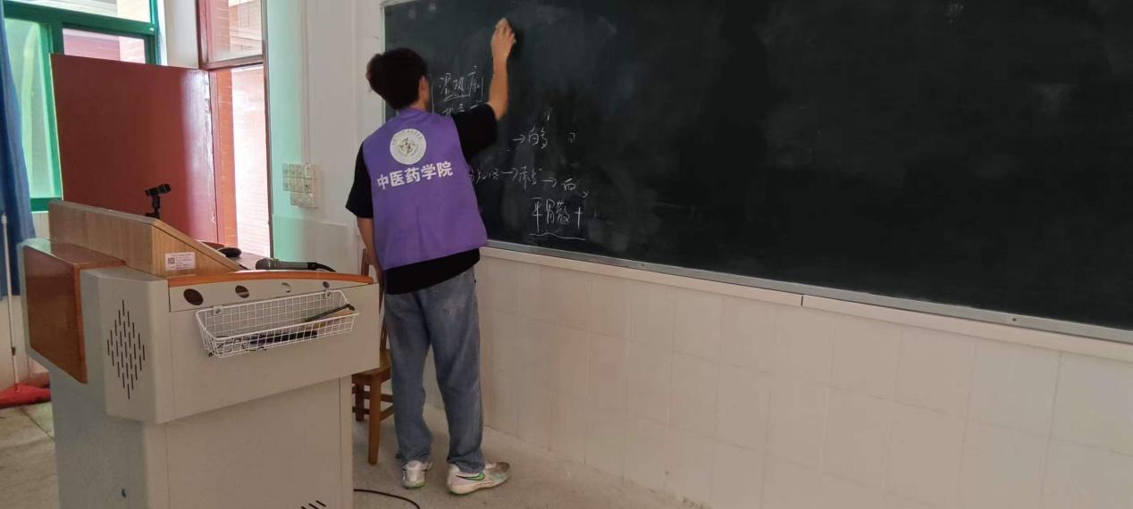 志愿者手持黑板擦與濕抹布,逐間走進(jìn)教室,仔細(xì)擦拭黑板上的粉筆字跡與浮塵,反復(fù)清理黑板邊框與角落的積灰,讓原本布滿板書的黑板恢復(fù)整潔清爽,為后續(xù)課堂教學(xué)提供干凈的書寫環(huán)境。