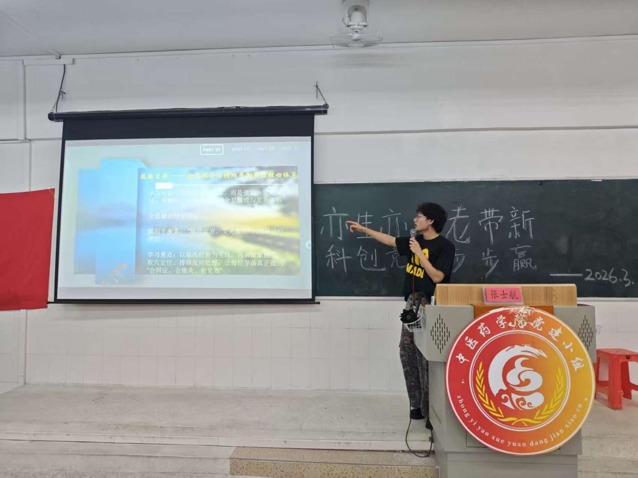 2026年3月19日晚,由中醫(yī)藥學院直屬黨總支主辦,中醫(yī)藥學院黨建小組與中醫(yī)藥應(yīng)用研究所協(xié)辦的黨建引領(lǐng)“亦生亦師”項目化課程系列講座第八期在圖書館304教室成功舉行。本次活動以“亦生亦師老帶新,科技創(chuàng)新步步贏”為主題,潘菽弢博士攜手學生講師張士航、黃樂淇開展分享,學院曾玉梅、劉嘉楣老師出席講座,24、25級學生共同參與?;顒?/span>圍繞科創(chuàng)競賽、中醫(yī)技術(shù)傳承、團隊協(xié)作、學生成長等方面開展,旨在以老帶新培育學生講師,創(chuàng)建創(chuàng)新創(chuàng)業(yè)團隊,夯實中醫(yī)藥傳承與科創(chuàng)實力。