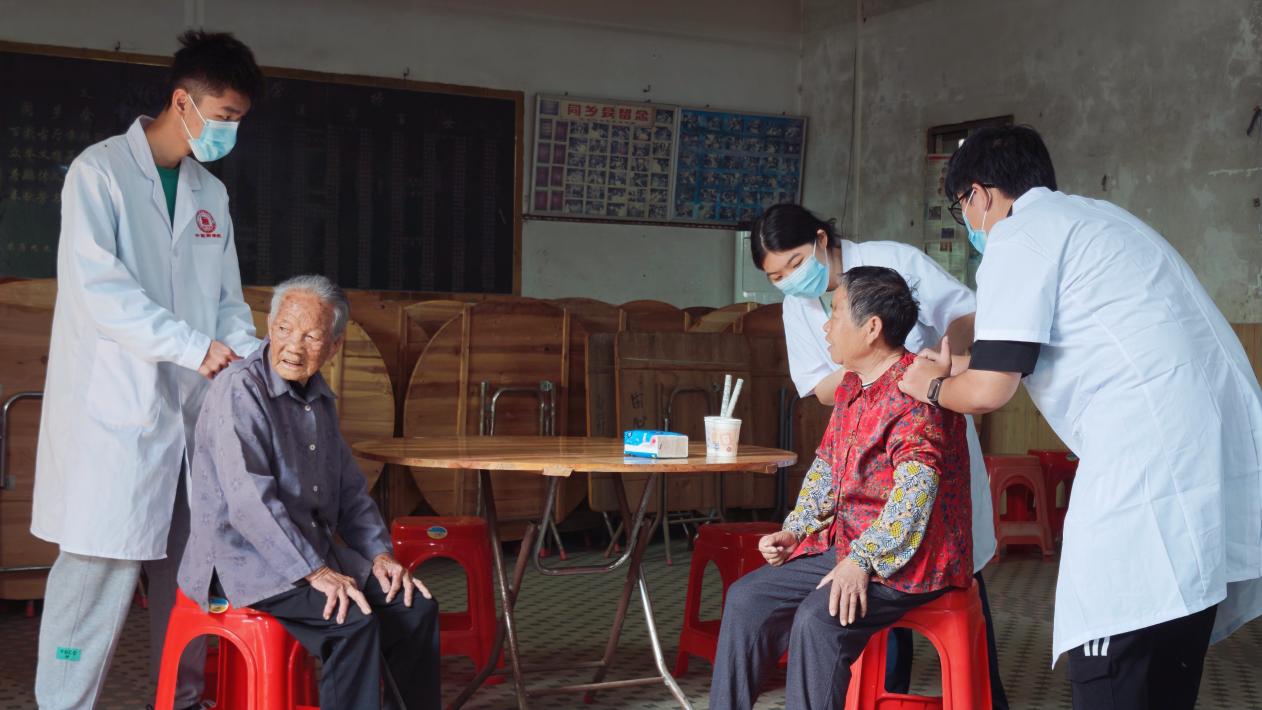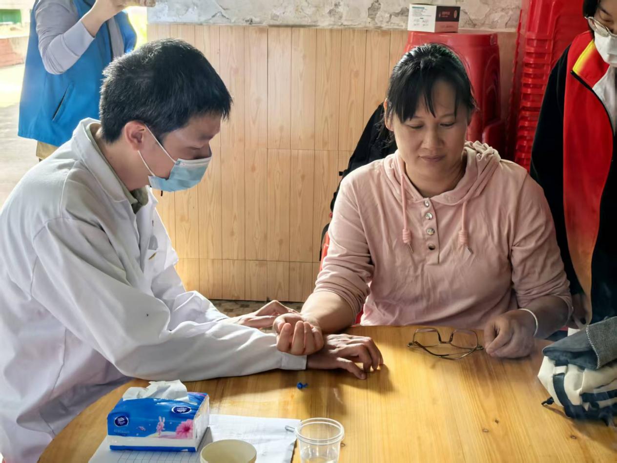 活動由潘菽弢、李楚勇、黃榮派三位老師帶隊,學院黨建小組、中醫(yī)藥應(yīng)用研究所、就業(yè)促進會選派11名同學組成志愿服務(wù)隊,與社工站工作人員協(xié)同配合,有序開展各項服務(wù)。在田心村村委會集中義診點,志愿者們細致為村民測量血壓,提供艾灸、推拿等中醫(yī)適宜技術(shù)服務(wù),耐心解答健康咨詢。潘菽弢博士現(xiàn)場為村民脈診,結(jié)合體質(zhì)特點給出個性化養(yǎng)生建議與調(diào)理方案,用專業(yè)知識守護村民健康。