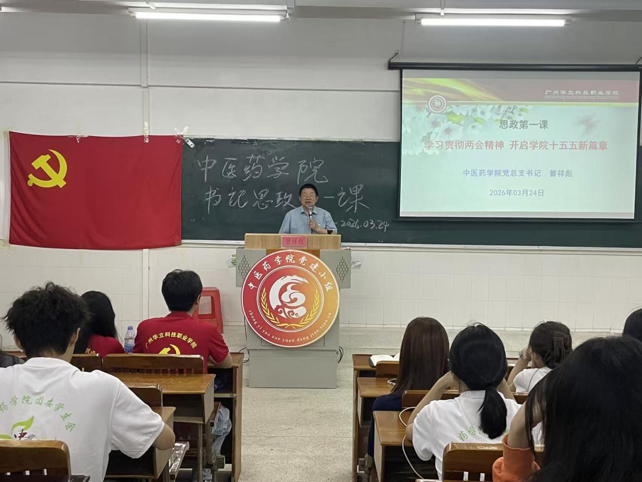 2026年3月24日,廣州華立科技職業(yè)學(xué)院中醫(yī)藥學(xué)院于圖書館401教室開展思政第一課專題學(xué)習(xí)活動(dòng)。本次課程由中醫(yī)藥學(xué)院黨總支書記曾祥彪主講,學(xué)院師生代表齊聚一堂,深入學(xué)習(xí)貫徹全國兩會精神,緊扣國家發(fā)展戰(zhàn)略,共同探討學(xué)院開啟“十五五”發(fā)展新篇章的實(shí)踐路徑,凝聚師生奮進(jìn)力量。